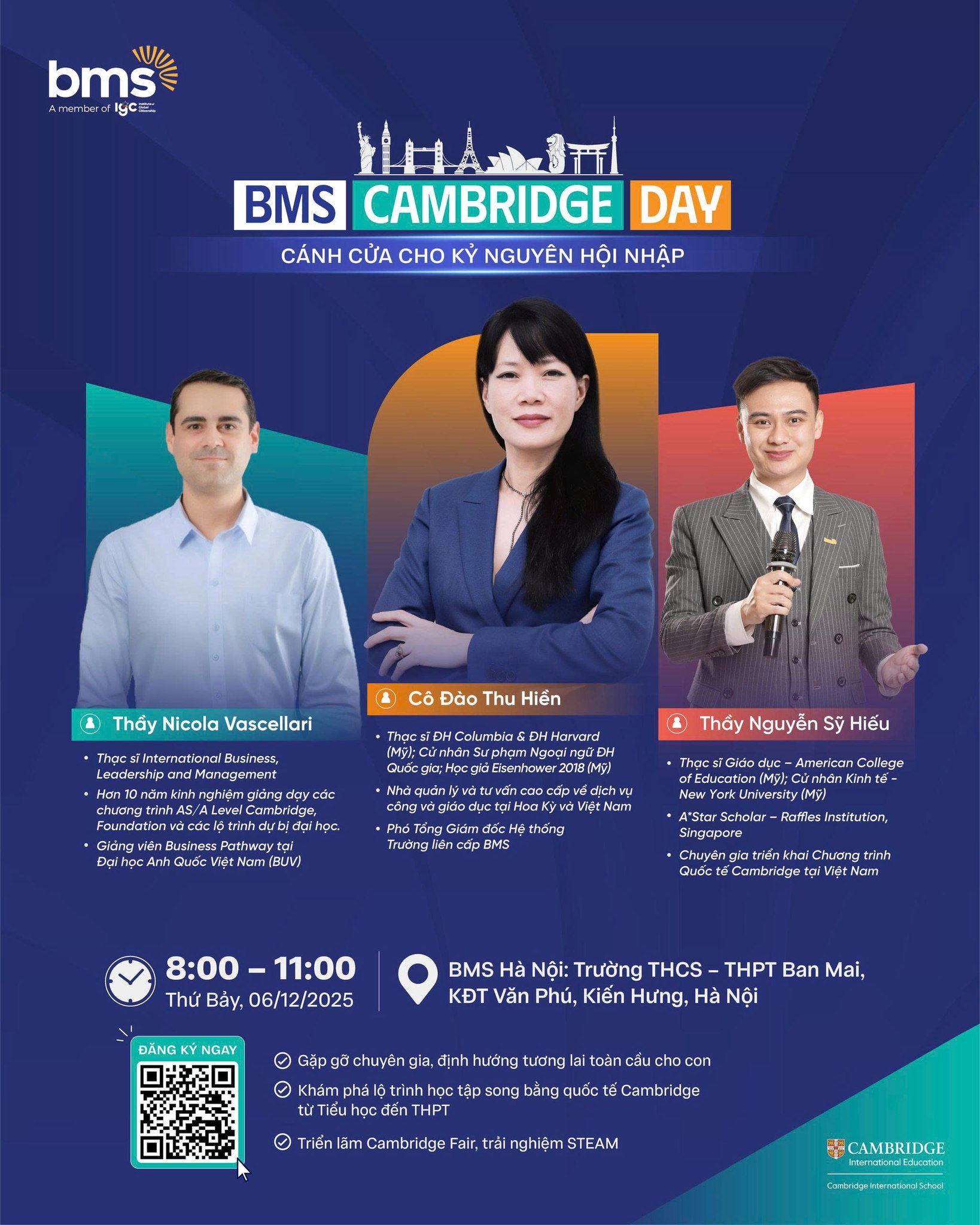 BMS Cambridge Day là sự kiện dành cho cha mẹ, học sinh từ 4 đến 14 tuổi, mở ra cơ hội trải nghiệm, khám phá và định hướng lộ trình học tập quốc tế. Tại đây, học sinh tham gia các hoạt động học tập sáng tạo, dự án trải nghiệm, kết nối trực tiếp với đội ngũ giáo viên, chuyên gia học thuật và các đối tác giáo dục uy tín toàn cầu.