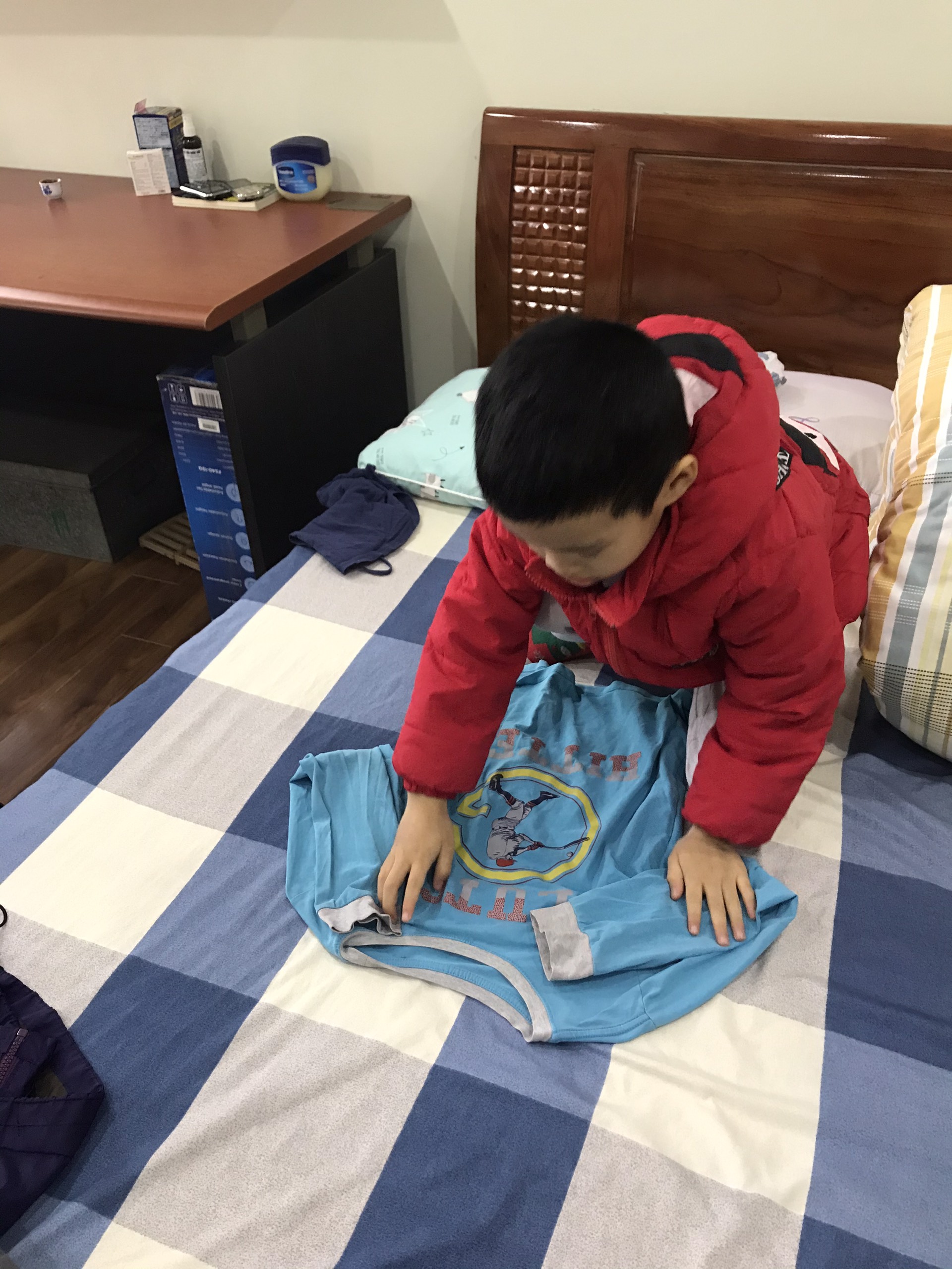 Gấp quần áo gọn gàng là công việc yêu thích của bạn Ngô Thế Sơn lớp Misa 6