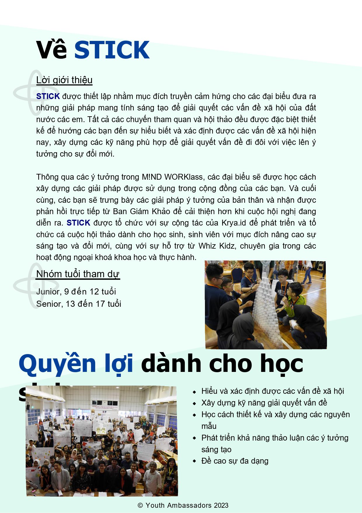 Thông qua các ý tưởng trong M!ND WORKlass, các đại biểu sẽ được học cách xây dựng các giải pháp được sử dụng trong cộng đồng của các bạn. Và cuối cùng, các bạn sẽ trưng bày các giải pháp ý tưởng của bản thân và nhận được phản hồi trực tiếp từ Ban Giám Khảo để cải thiện hơn khi cuộc hội nghị đang diễn ra. STICK được tổ chức với sự cộng tác của Krya.id để phát triển và tổ chức cá cuộc hội thảo dành cho học sinh, sinh viên với mục đích nâng cao sự sáng tạo và đổi mới, cùng với sự hỗ trợ từ Whiz Kidz, chuyên gia trong các hoạt động ngoại khoá khoa học và thực hành.