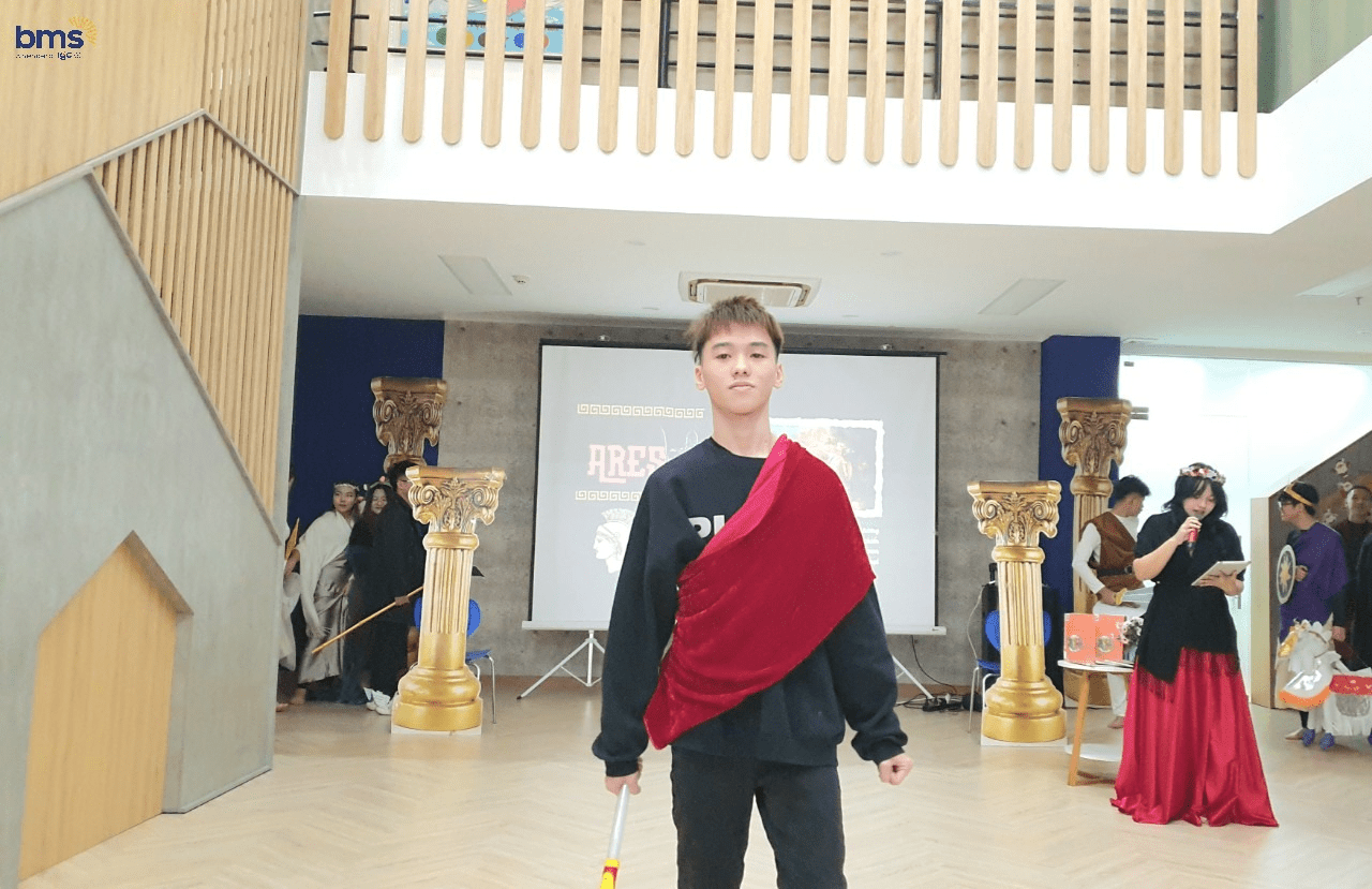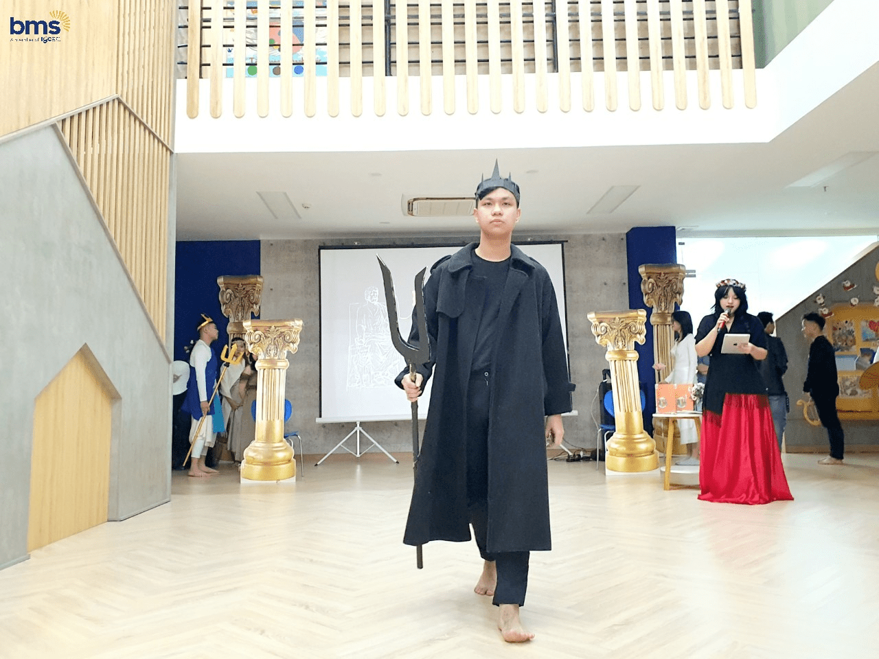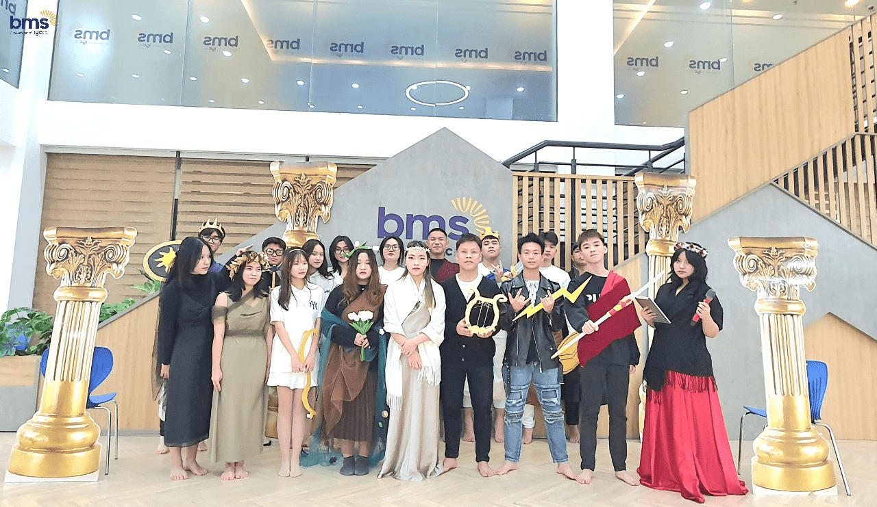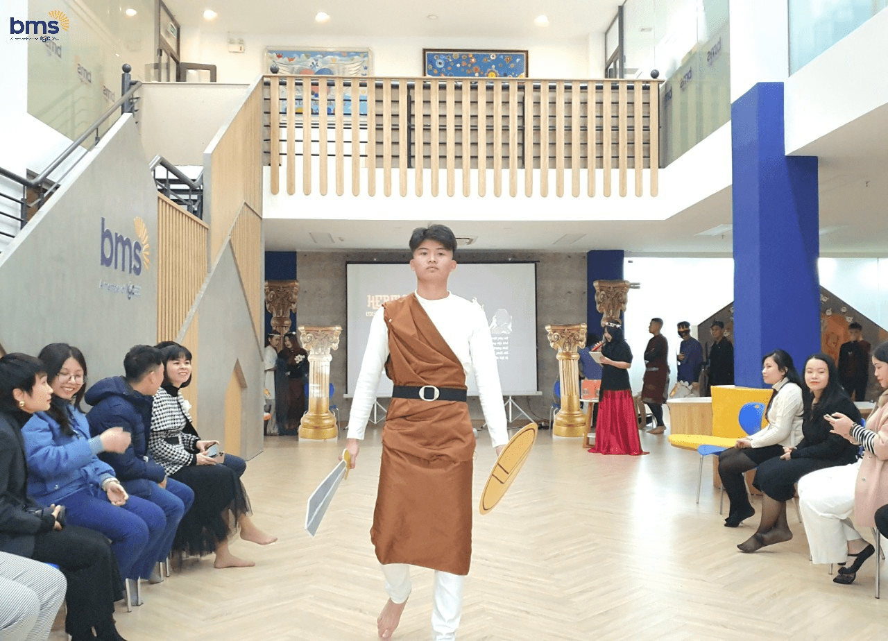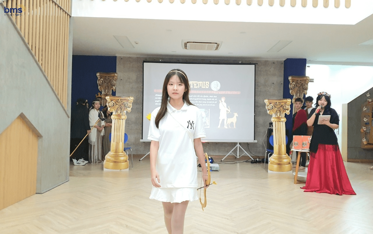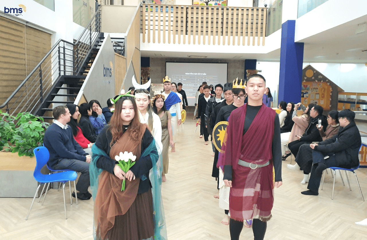Không chỉ có sự chuẩn bị kỹ lưỡng về trang phục mà các bạn học sinh lớp 12S còn mô phỏng chi tiết về tính cách của các vị thần thông qua hành động, biểu cảm khuôn mặt và cách trình diễn trên sân khấu. Các bạn thực sự đã hóa thân trọn vẹn để trở thành những vị thần đầy quyền năng trong thần thoại Hy Lạp.