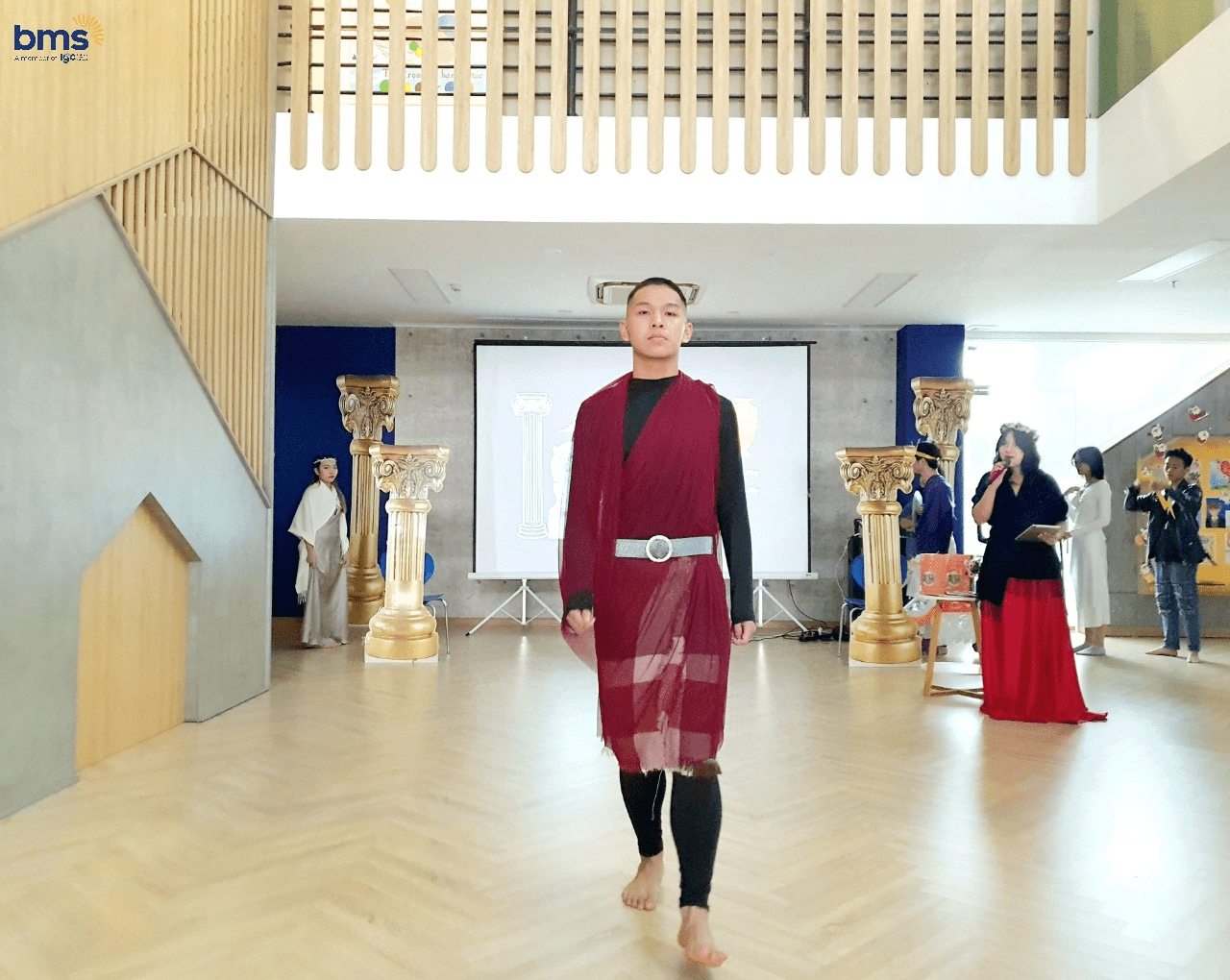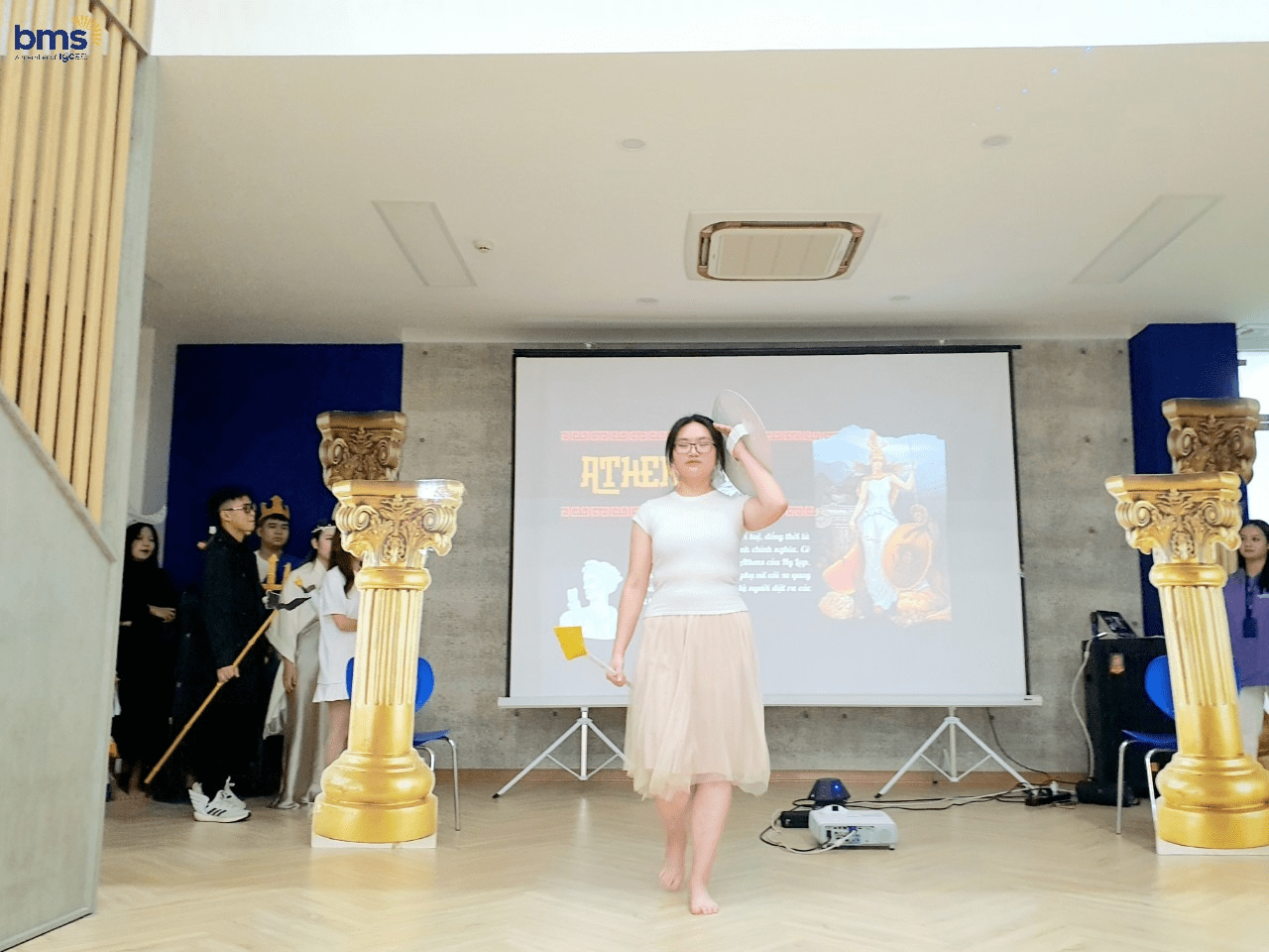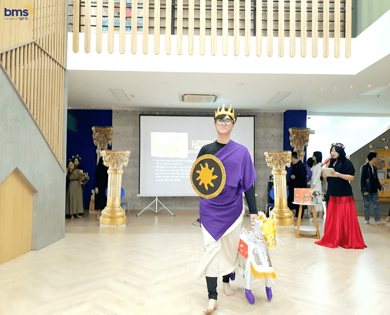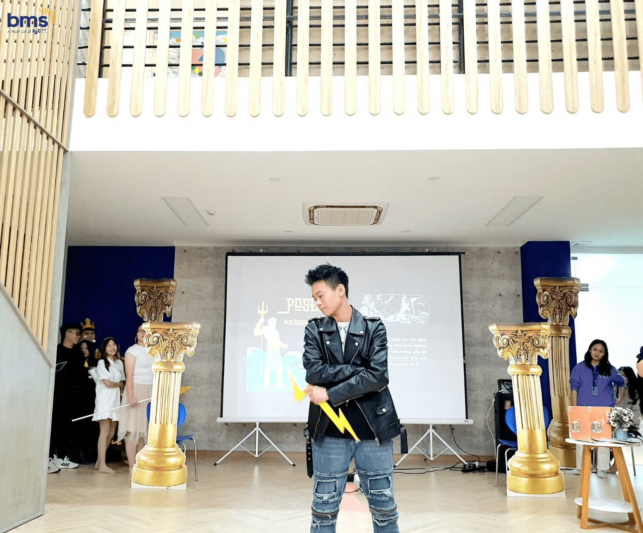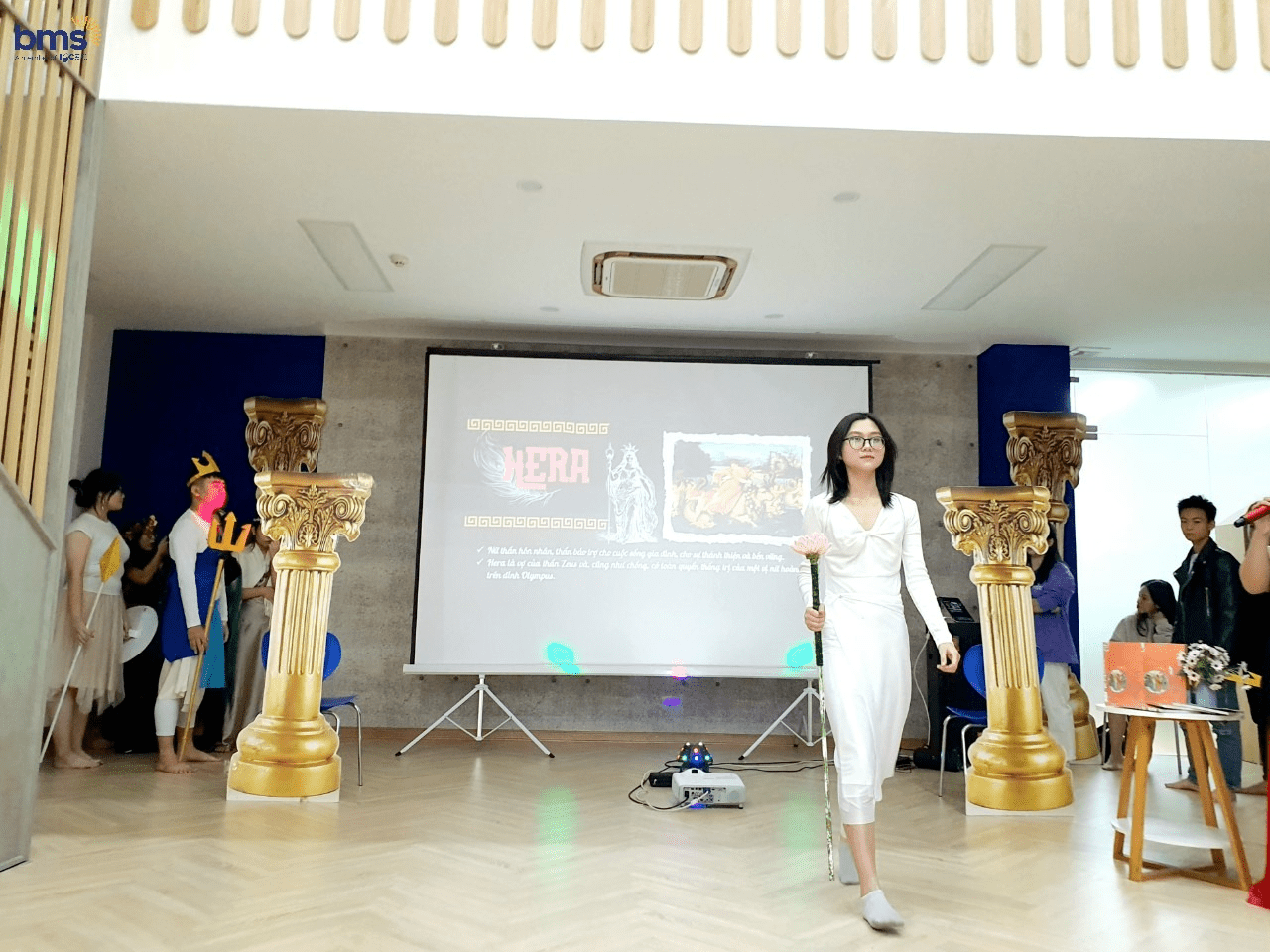 Không chỉ có sự chuẩn bị kỹ lưỡng về trang phục mà các bạn học sinh lớp 12S còn mô phỏng chi tiết về tính cách của các vị thần thông qua hành động, biểu cảm khuôn mặt và cách trình diễn trên sân khấu. Các bạn thực sự đã hóa thân trọn vẹn để trở thành những vị thần đầy quyền năng trong thần thoại Hy Lạp.