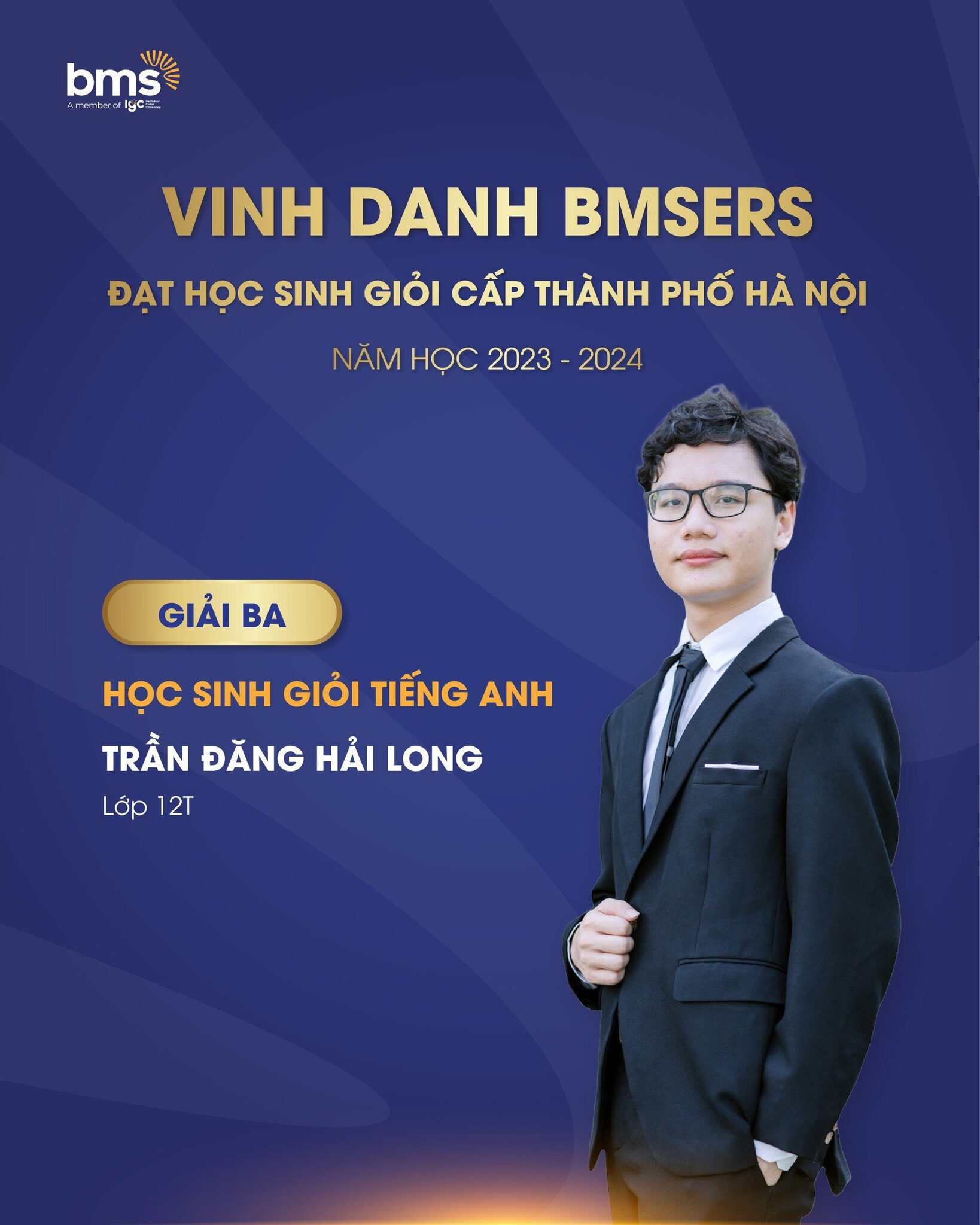 Trường THPT Ban Mai tự hào chúc mừng học sinh Trần Đăng Bảo Long – Lớp 12T đã đạt giải Ba môn Tiếng Anh trong kỳ thi Học sinh giỏi cấp Thành phố năm học 2023- 2024
