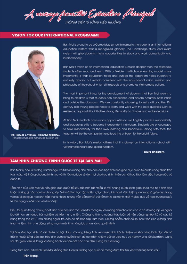 Tại Trường THCS – THPT Ban Mai, chương trình song ngữ quốc tế Cambridge đã được triển khai từ lớp 6 đến lớp 8, với số lượng lớp nhất định theo từng khối, song song với chương trình đào tạo nhân cách và trí tuệ đang được giảng dạy tại Ban Mai.