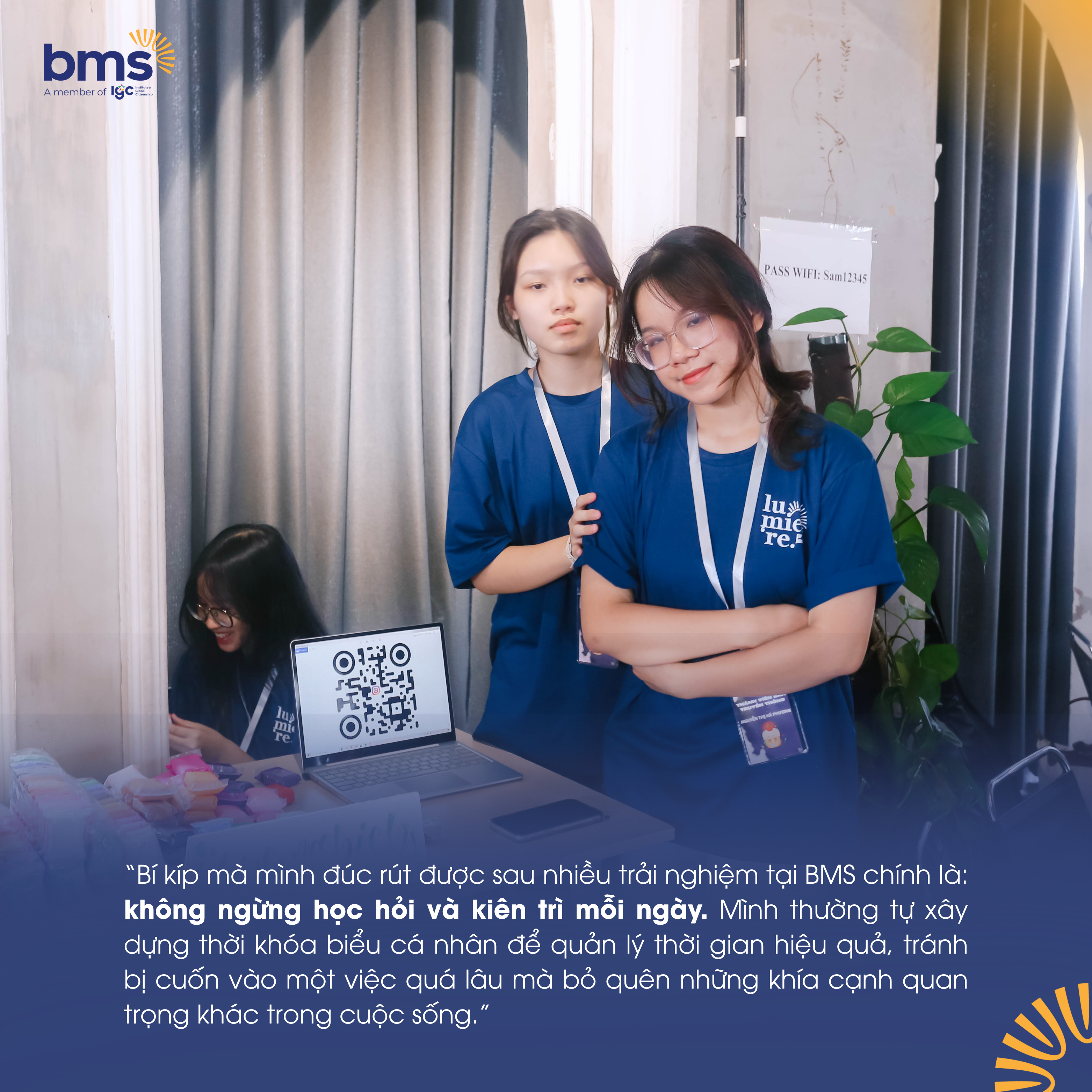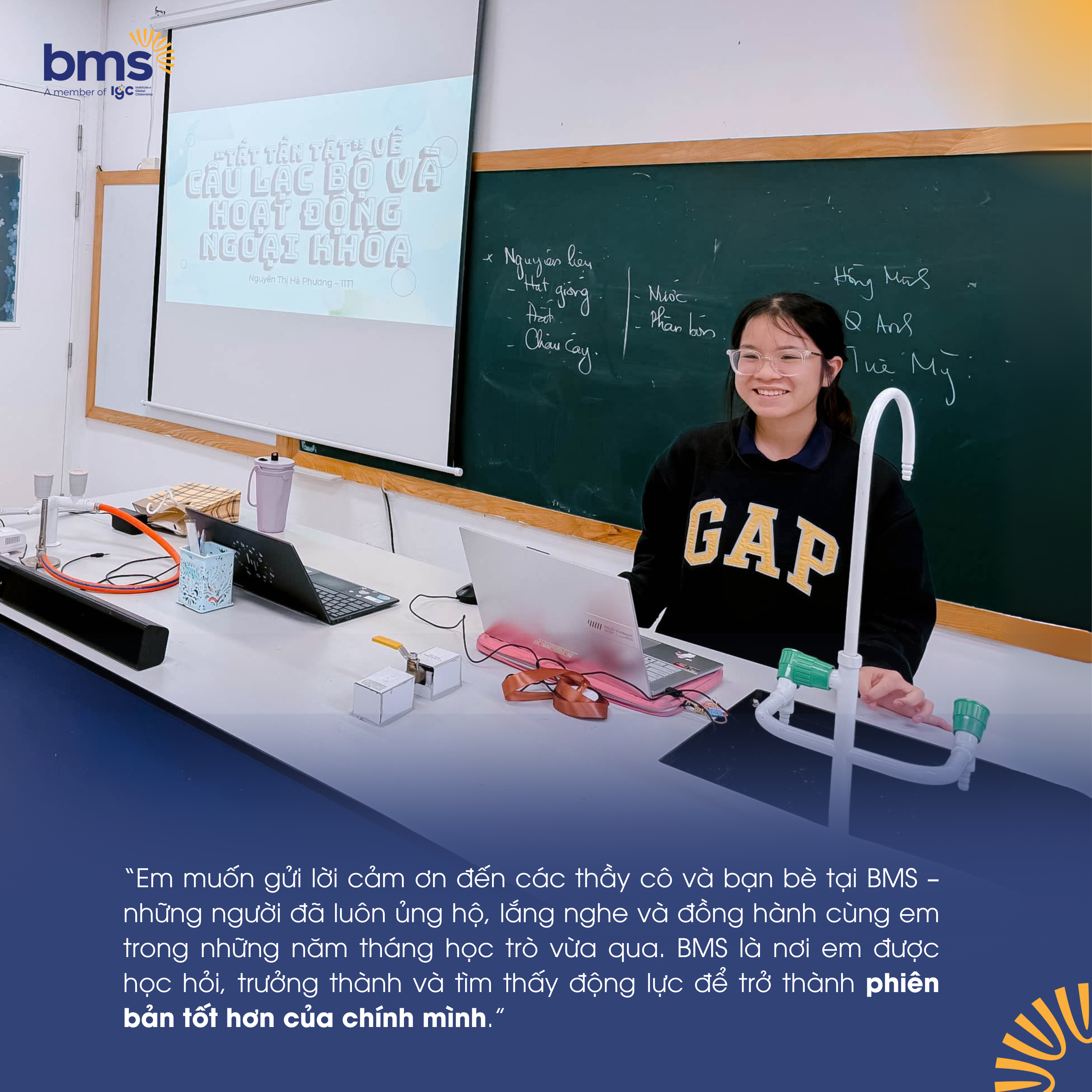 Nhìn lại chặng đường đã đi qua, điều Hà Phương trân trọng nhất là ở quá trình bản thân từng bước thay đổi. Em cho rằng chính môi trường học tập tại BMS – nơi khuyến khích học sinh thể hiện quan điểm, được phép thử và được lắng nghe đã tạo nên nền tảng cho sự trưởng thành ấy. “Em muốn gửi lời cảm ơn đến các thầy cô và bạn bè tại BMS – những người đã luôn ủng hộ, lắng nghe và đồng hành cùng em trong suốt thời gian qua. BMS là nơi em được học hỏi, trưởng thành và tìm thấy động lực để theo đuổi phiên bản tốt hơn của chính mình.”