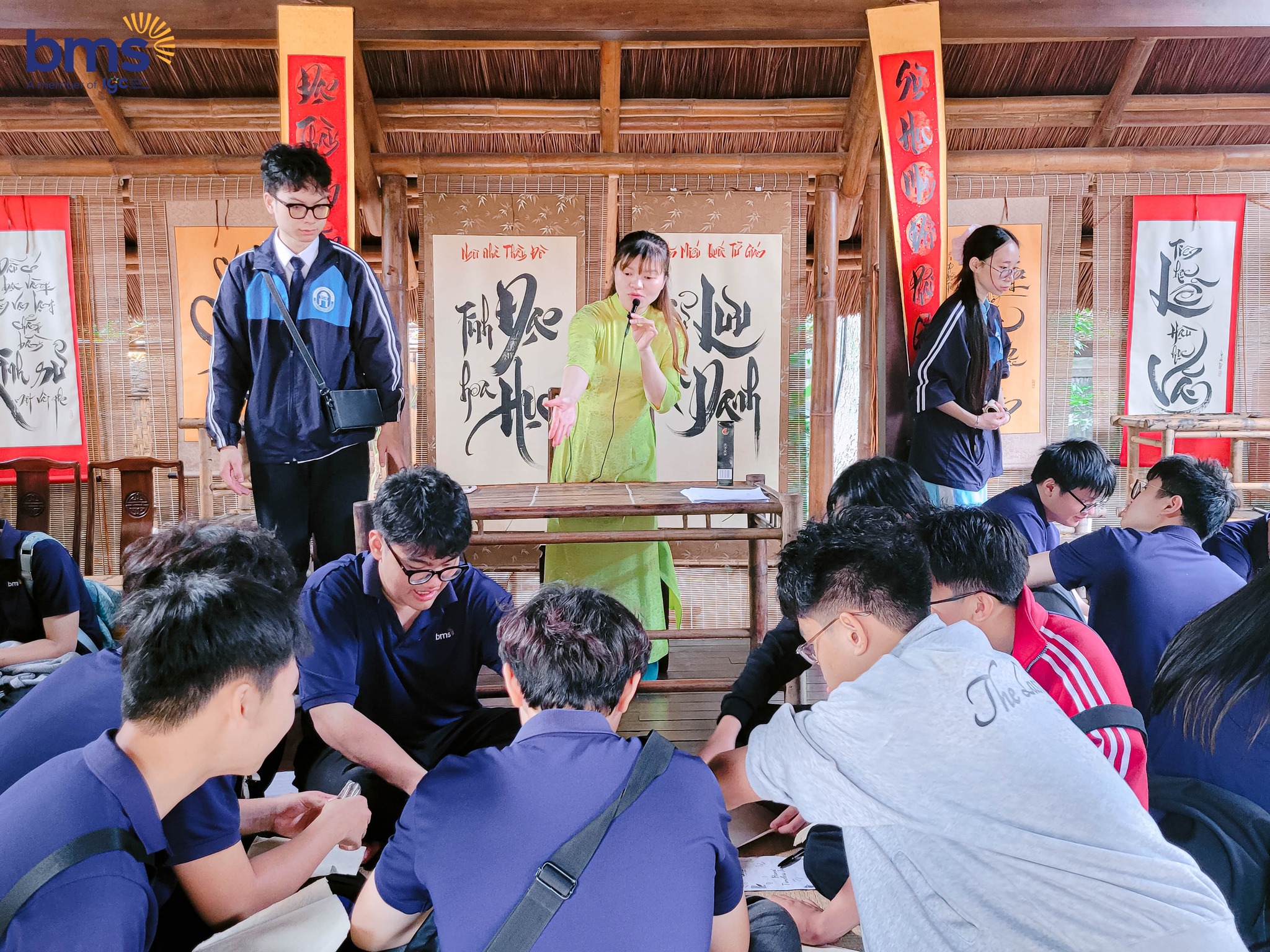 Tập thể 11T2 chọn hành trình khám phá cội nguồn chữ Hán. Thông qua việc tìm hiểu cấu trúc chữ, ý nghĩa hoành phi – câu đối và trải nghiệm in mộc bản, học sinh tiếp cận triết lý “nét chữ – nết người”, cảm nhận chiều sâu văn hóa được kết tinh trong từng con chữ.