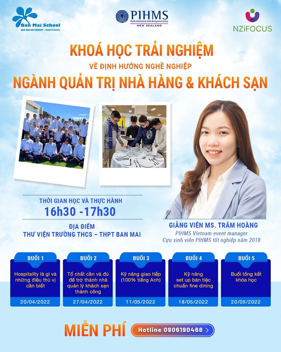 Nằm trong chuỗi sự kiện định hướng nghề nghiệp dành cho học sinh khối THPT đây là chuỗi khóa học trực tiếp miễn phí 100% dành cho học sinh Trường THCS – THPT Ban Mai. Chương trình này phù hợp với học sinh quan tâm tới ngành Quản trị nhà hàng & khách sạn và mong muốn có nhu cầu được cọ sát với môi trường quốc tế và rèn luyện năng lực sử dụng tiếng Anh.