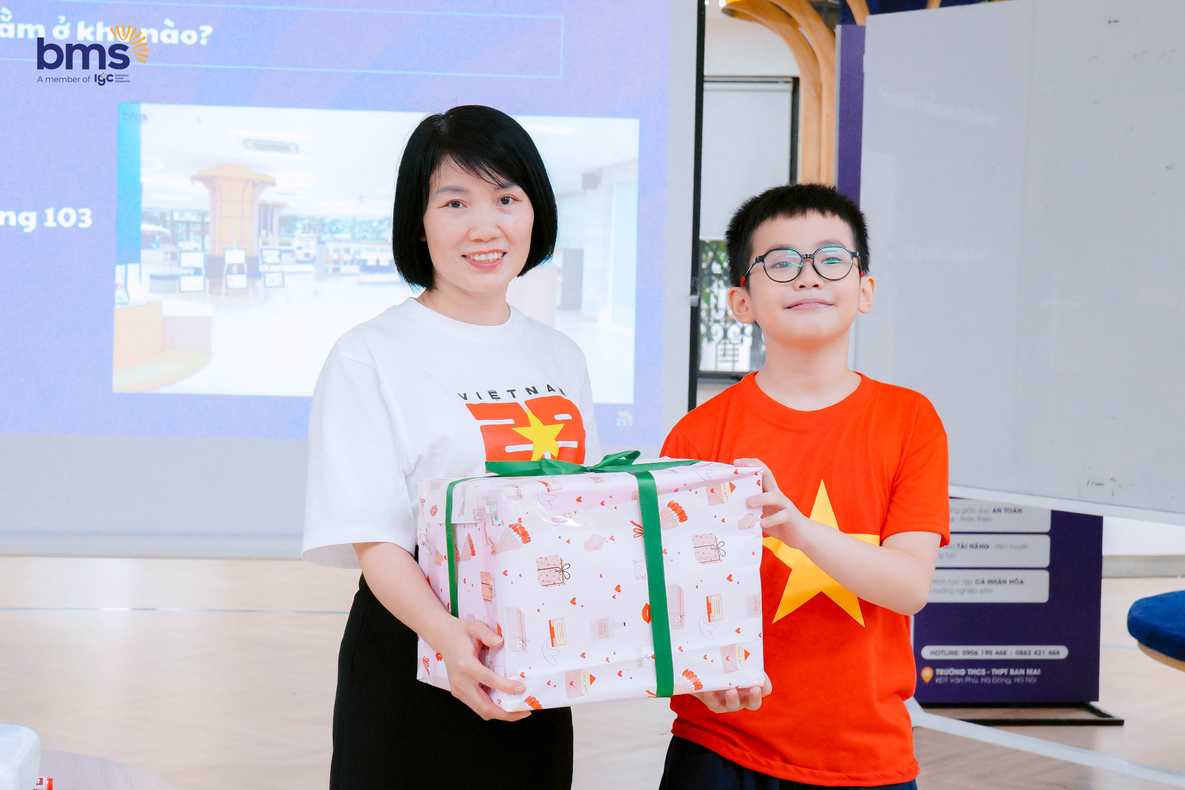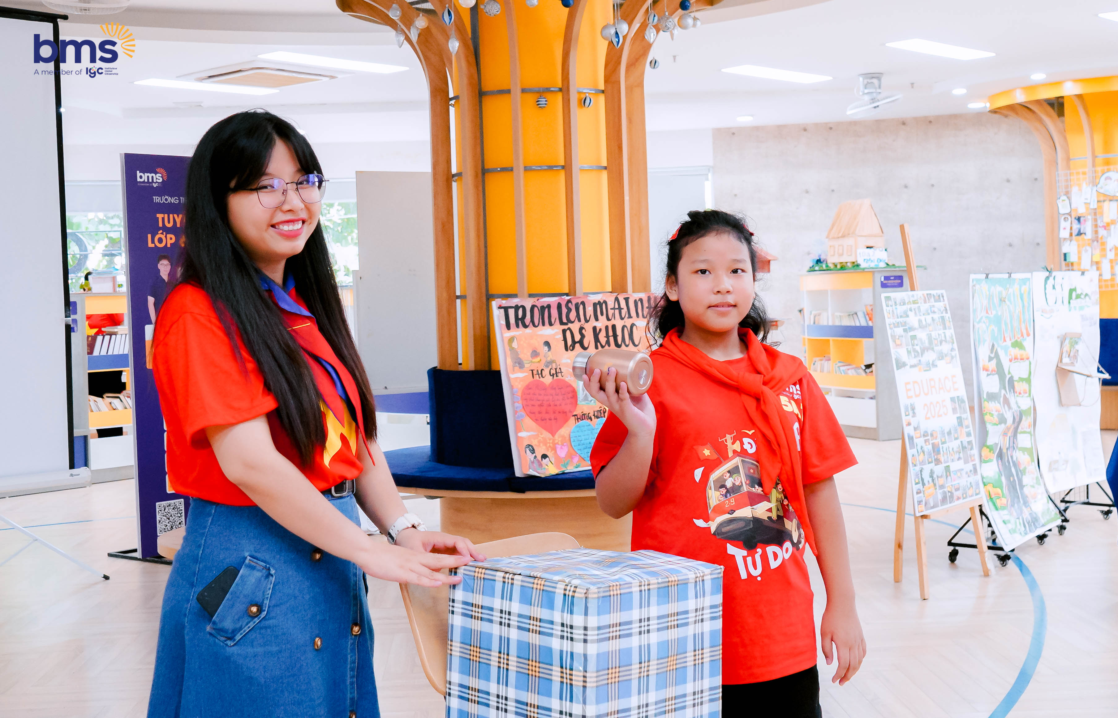 Tại thư viện BMS, các bạn nhỏ say mê bước vào thế giới sách phong phú, trò chuyện cùng thầy cô và bạn bè. Tiếng cười vang khắp phòng khi các trò chơi được tổ chức, những món quà bất ngờ được trao tạo nên một không gian rộn rã, tràn đầy năng lượng.