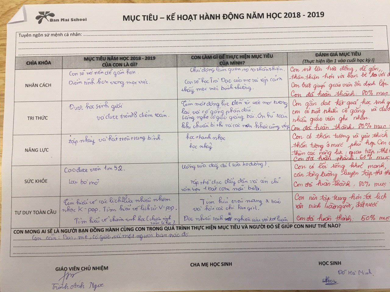 Trải qua một học kỳ học tập và sinh hoạt tại Trường, mỗi học sinh đều được trải nghiệm, tự tin, trách nhiệm và trưởng thành hơn trong học tập và cuộc sống. Điều đó được thể hiện qua cách mỗi con biết tự xác lập mục tiêu cá nhân, thiết lập kế hoạch hành động và nỗ lực đồng hành, trợ giúp của Thầy Cô và Cha mẹ.