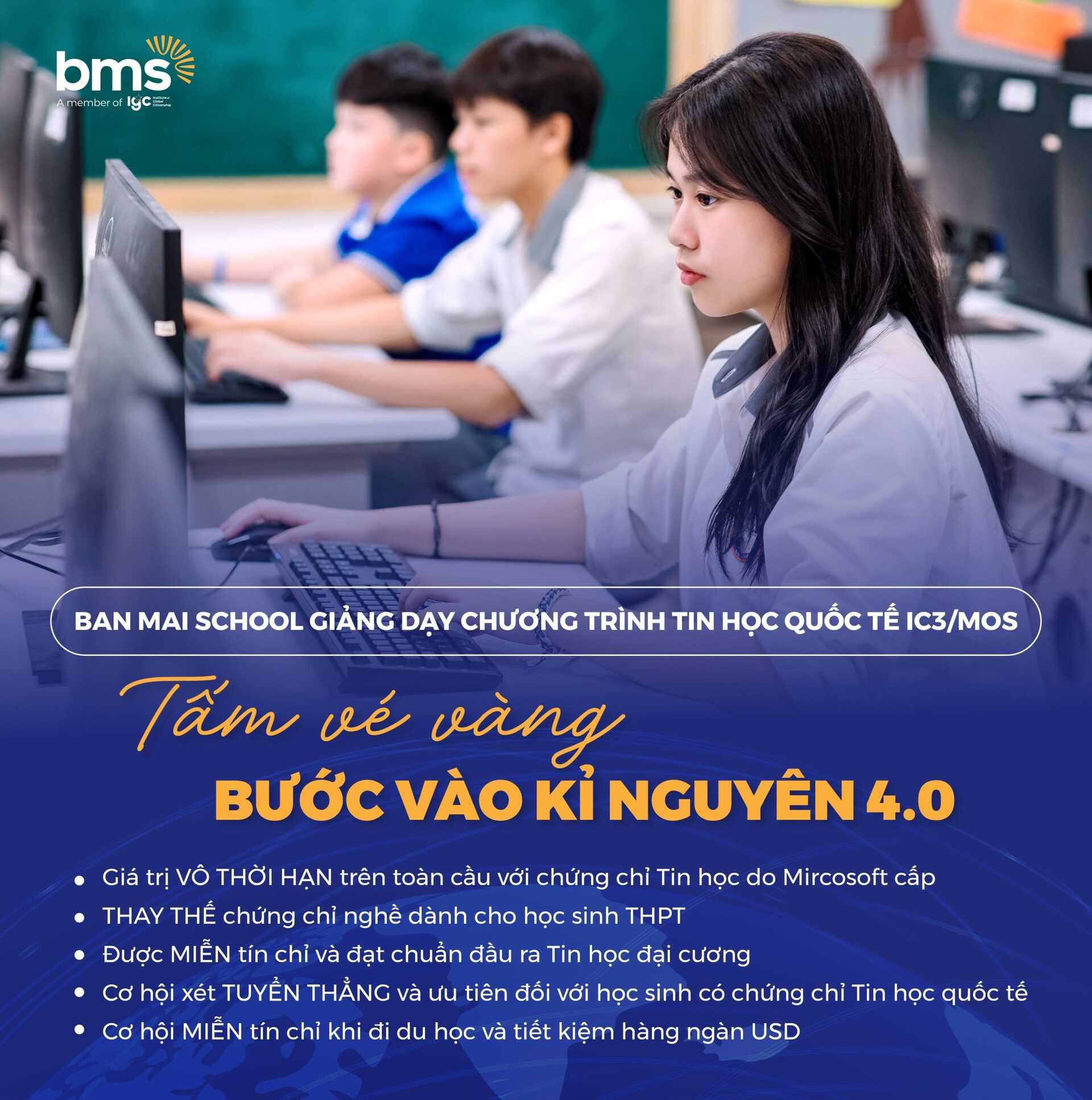 Chú trọng giáo dục Tin học quốc tế chính là chuẩn bị cho học sinh hành trang trên bước đường trở thành công dân toàn cầu. Công nghệ thông tin sẽ là công cụ để học sinh trau dồi kiến thức, mở rộng tầm nhìn và mở cánh cửa bước ra thế giới. Trường THCS – THPT Ban Mai chính thức triển khai chương trình Tin học theo chuẩn đánh giá quốc tế: IC3 và MOS đối với lớp 6 và lớp 10 từ năm học 2023 – 2024.
