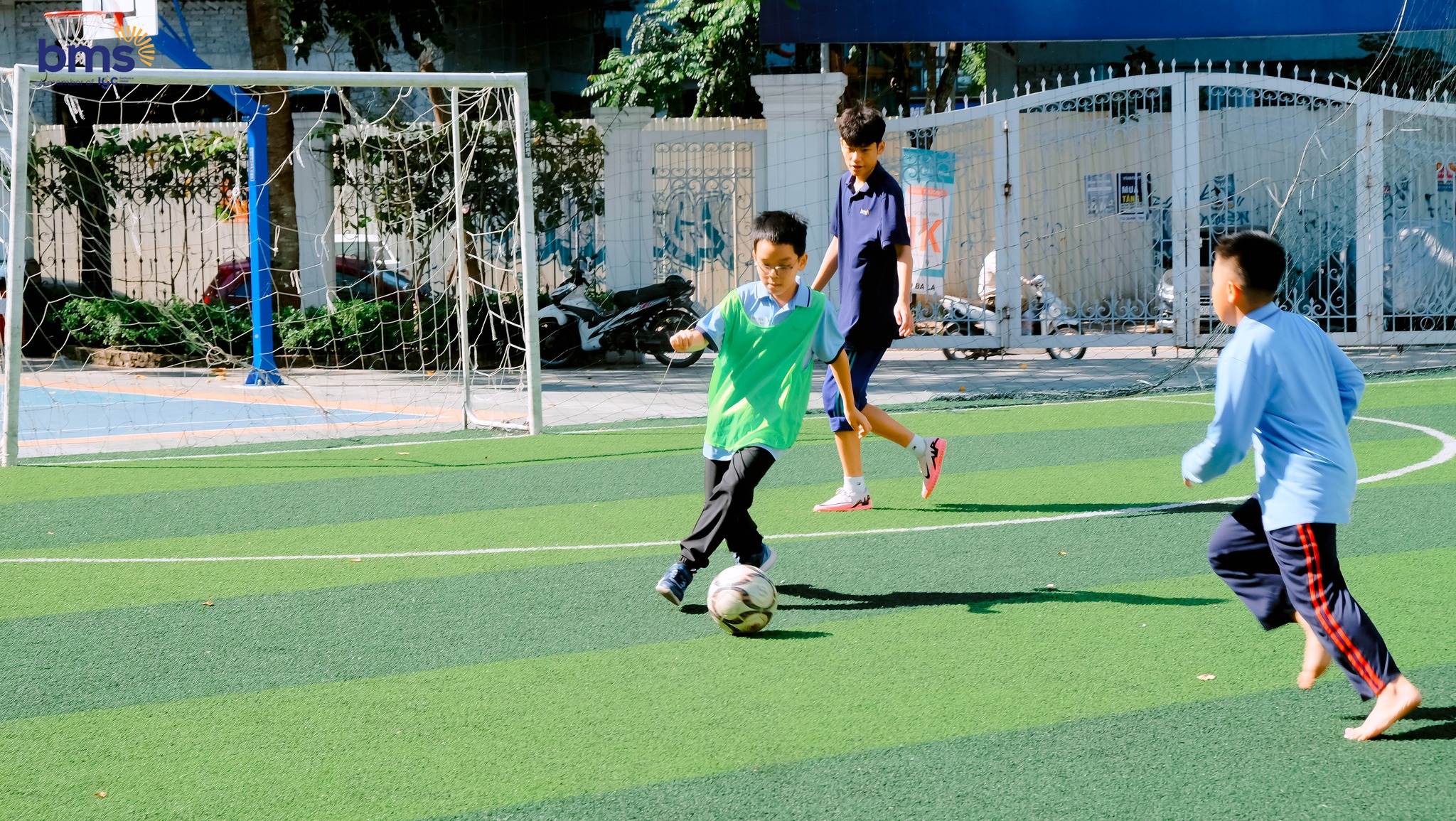 Trên sân thể thao, BMSers thử sức với bóng đá, bóng rổ và bóng sọt. Dưới sự hướng dẫn tận tình của giáo viên và các anh chị trợ giảng, các bạn phối hợp nhịp nhàng, cổ vũ nhau hết mình. Tiếng reo hò, những bước chạy nhanh nhẹn và nụ cười rạng rỡ lan tỏa khắp sân, tạo nên không khí sôi động và tràn đầy năng lượng.