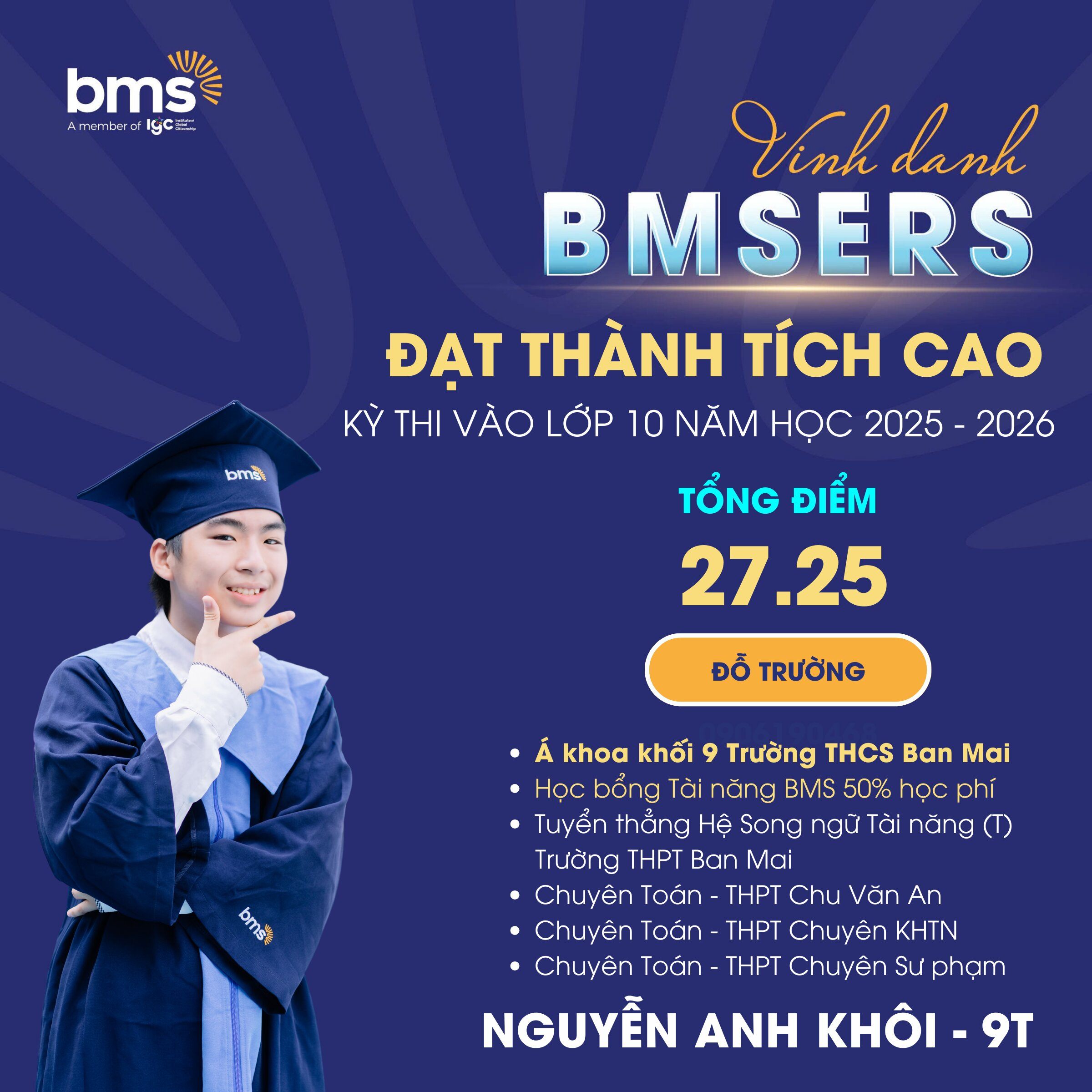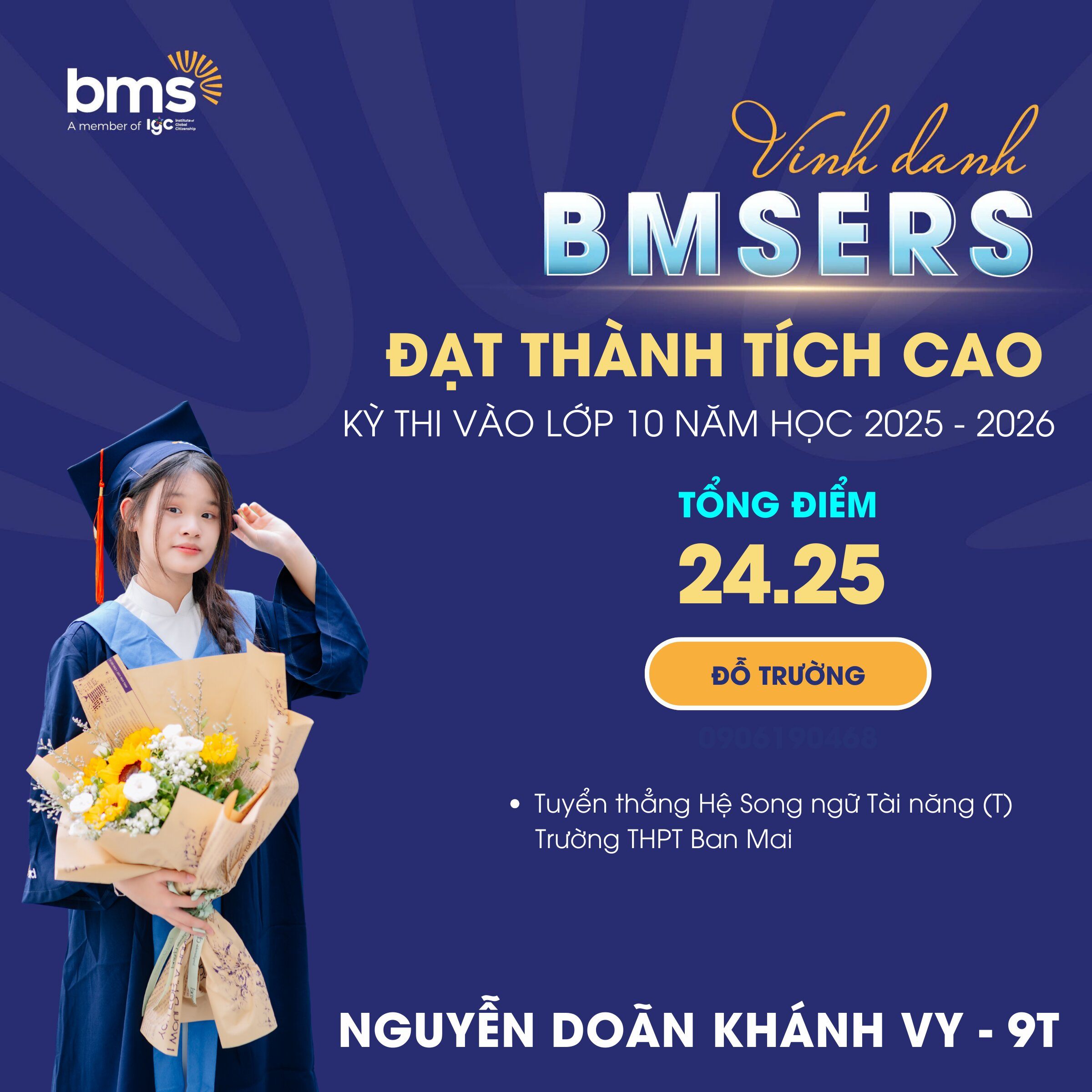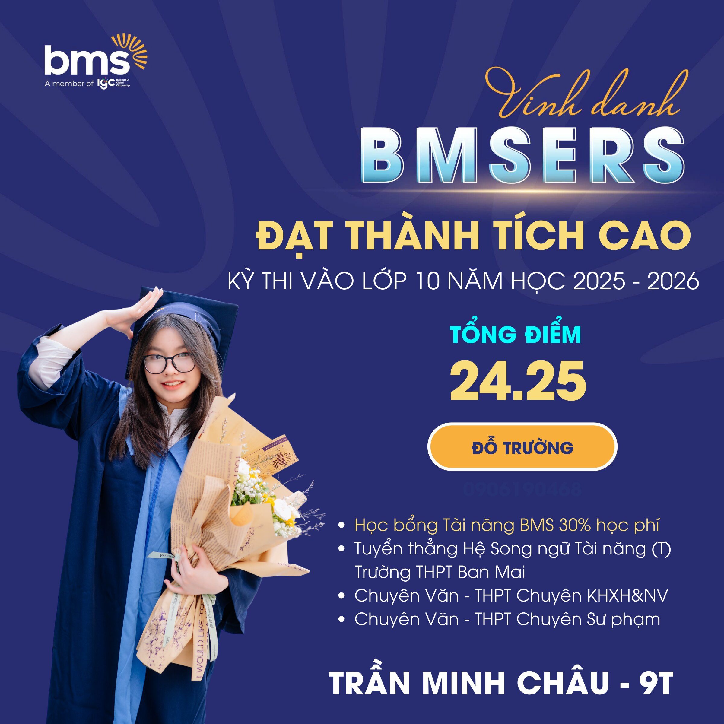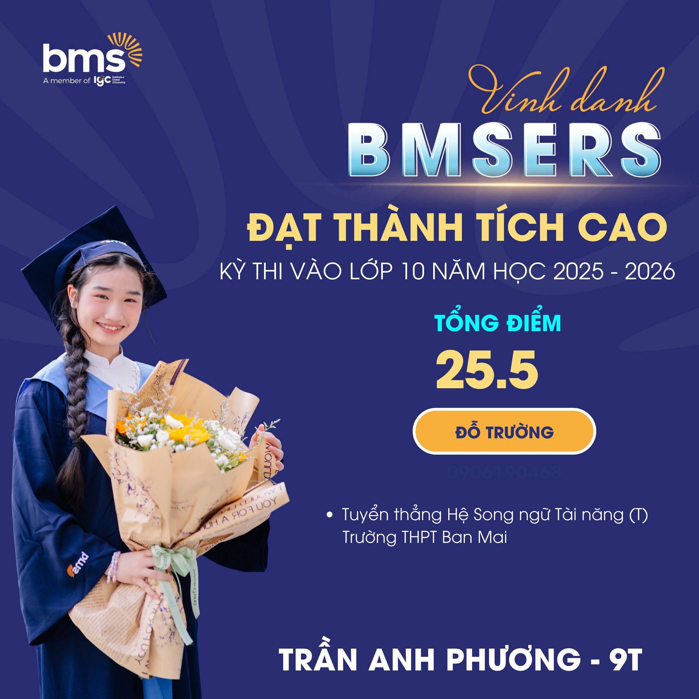 Đặc biệt, thành tích môn Tiếng Anh tiếp tục khẳng định thế mạnh vượt trội của BMS trong chương trình giáo dục ngoại ngữ: 25 học sinh đạt điểm 9, 10 môn Tiếng Anh. Phổ điểm trung bình môn Tiếng Anh: Lớp 9T: 9,1 điểm; Lớp 9i: 8,8 điểm; Lớp 9M1 & 9M2: 8,2 điểm.