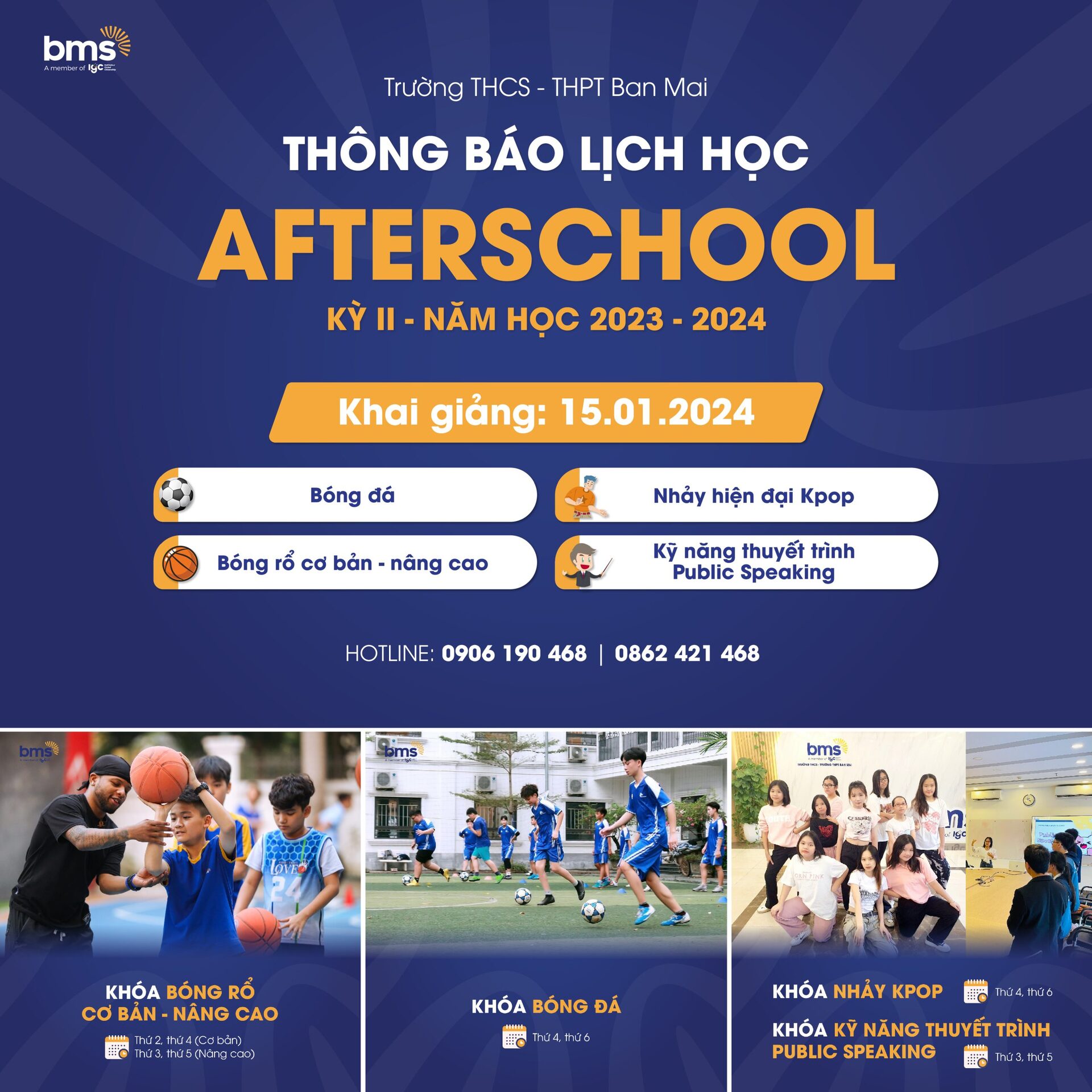 Các khóa học AfterSchool: Bóng đá; Bóng rổ, Nhảy Kpop, Kỹ năng thuyết trình – Public speaking…đã thu hút sự tham gia đông đảo của các học sinh tại BMS.
