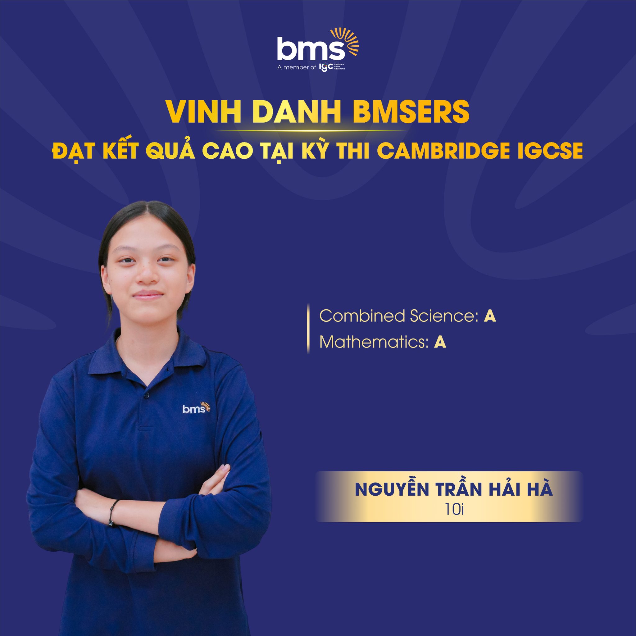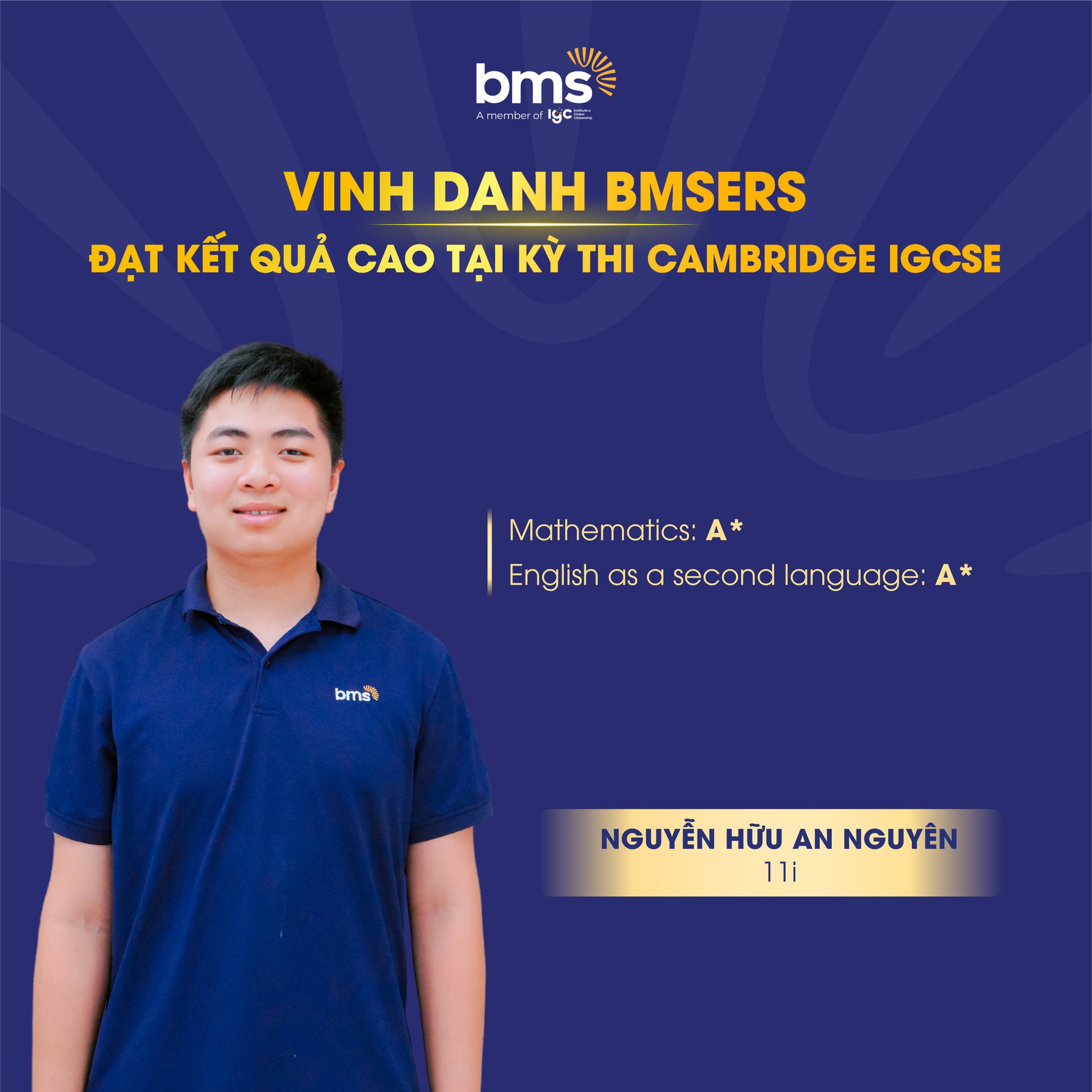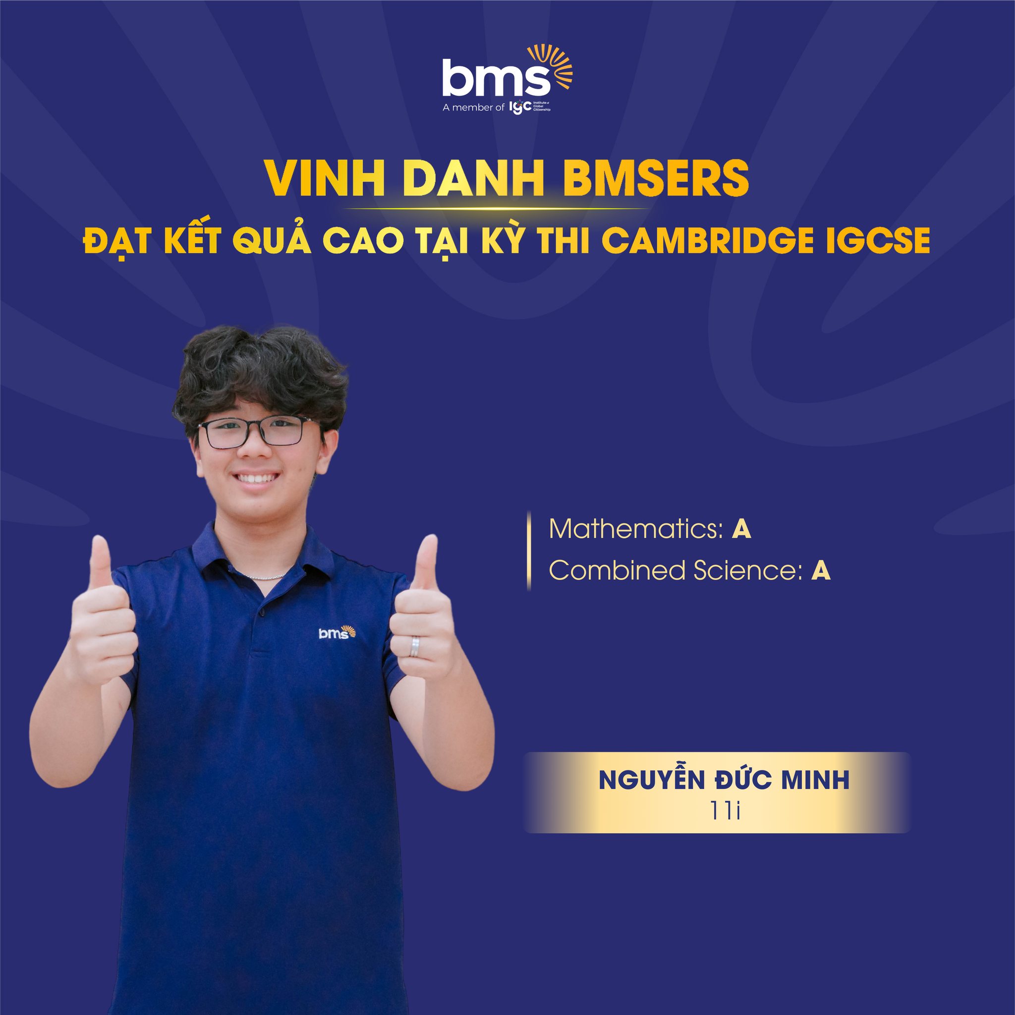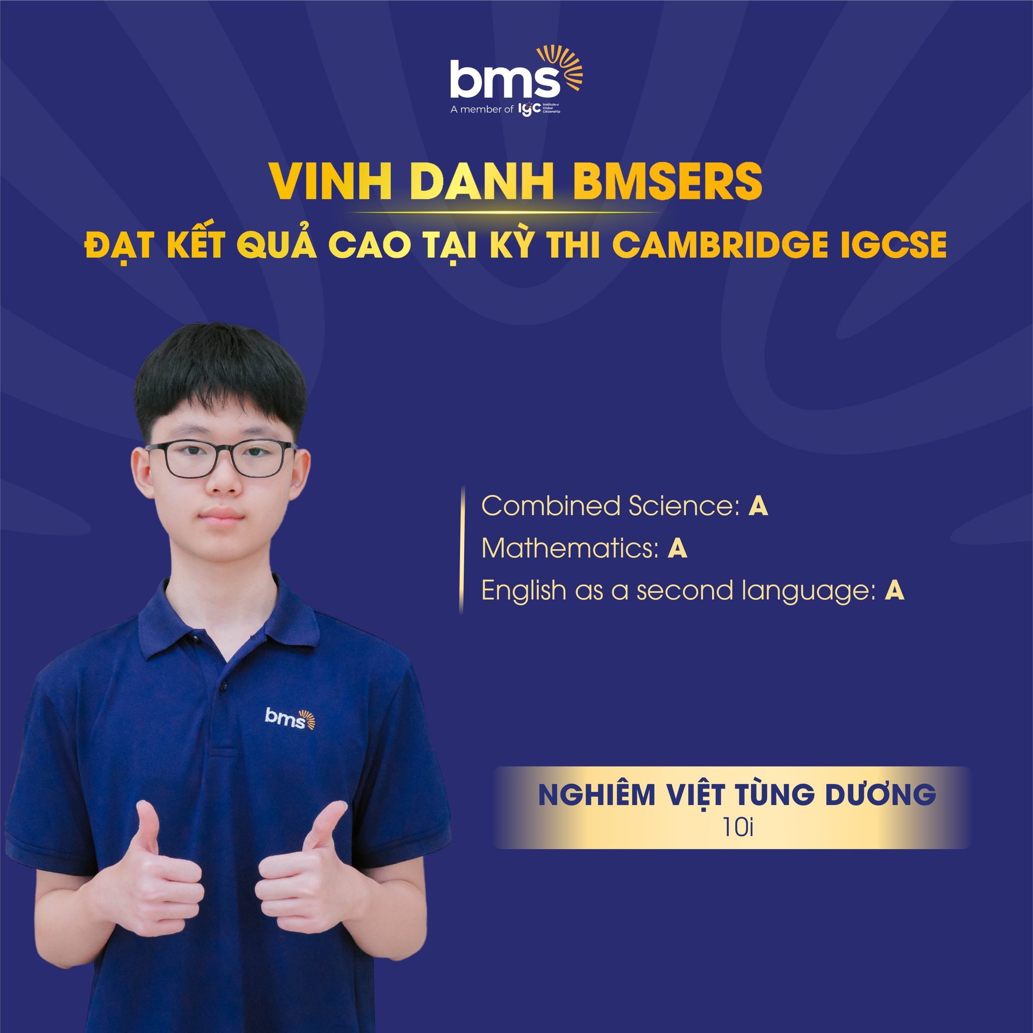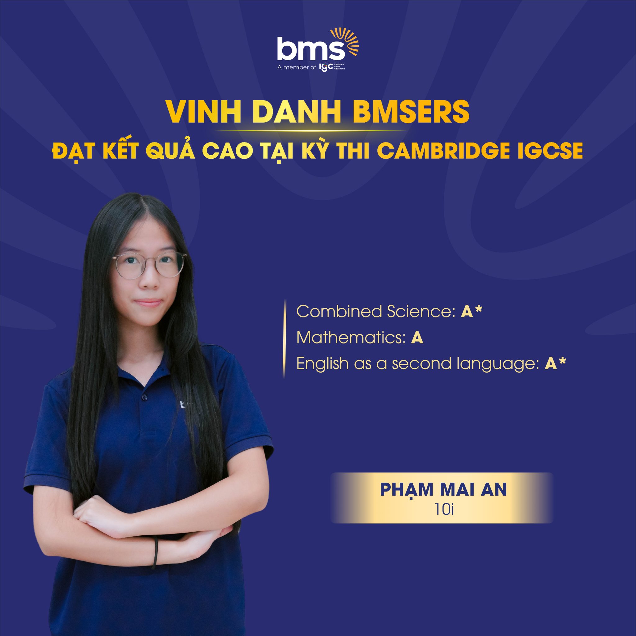 - Đặc biệt, BMSer Trịnh Đan Thu đã xuất sắc đạt trọn bộ điểm A* ở cả 3 môn gồm môn Mathematics, môn Combined Science và môn ESL.