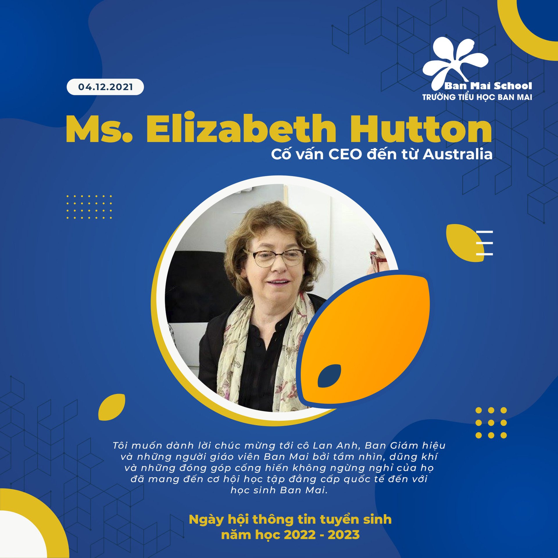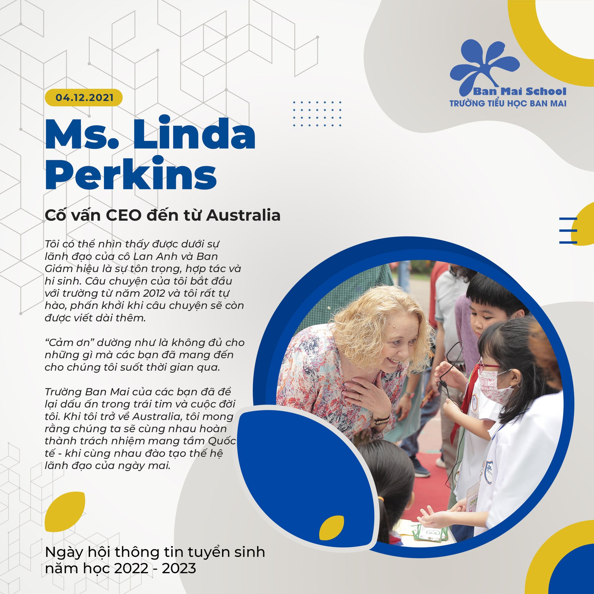 Tôi muốn dành lời chúc mừng tới cô Lan Anh, Ban Giám hiệu và những người giáo viên Ban Mai bởi tầm nhìn, dũng khí và những đóng góp cống hiến không ngừng nghỉ của họ đã mang đến cơ hội học tập đẳng cấp quốc tế đến với học sinh Ban Mai.