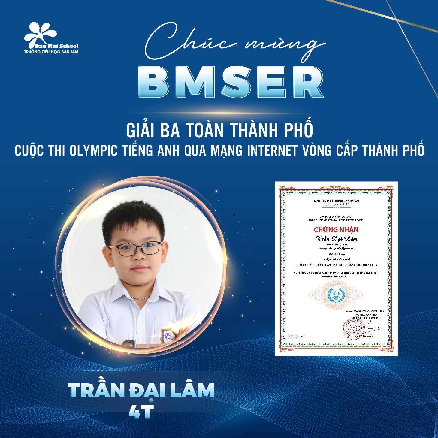 Chúc mừng 5 gương mặt BMSers đã đạt thành tích cao trong kỳ thi Giải Tiếng Anh qua mạng Internet (IOE) cấp Thành phố.