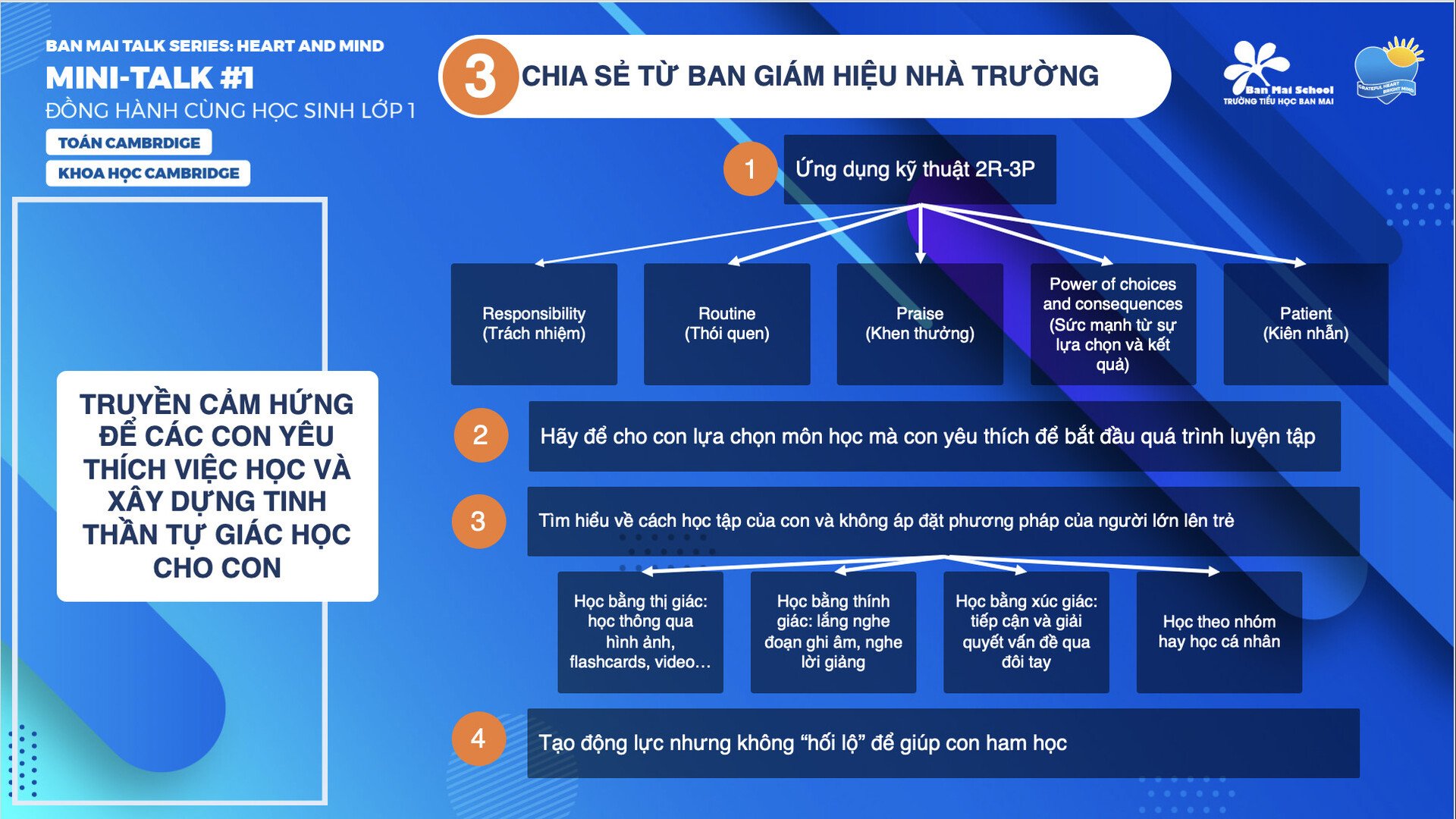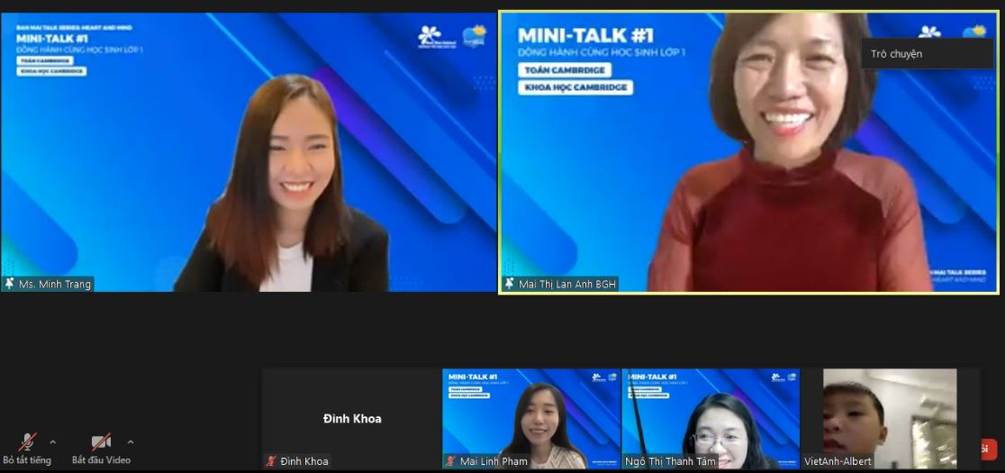 ‘Tìm ra phong cách học tập của các con là vô cùng quan trọng’ – Đó là lời khẳng định của cô giáo Ngô Thị Thanh Tâm (Phó Hiệu trưởng trường Tiểu học Ban Mai) tại chương trình Mini talk: “Đồng hành cùng học sinh lớp 1” – dành cho hai lớp Quốc tế 1i1, 1i2 trong chiều 16/10.