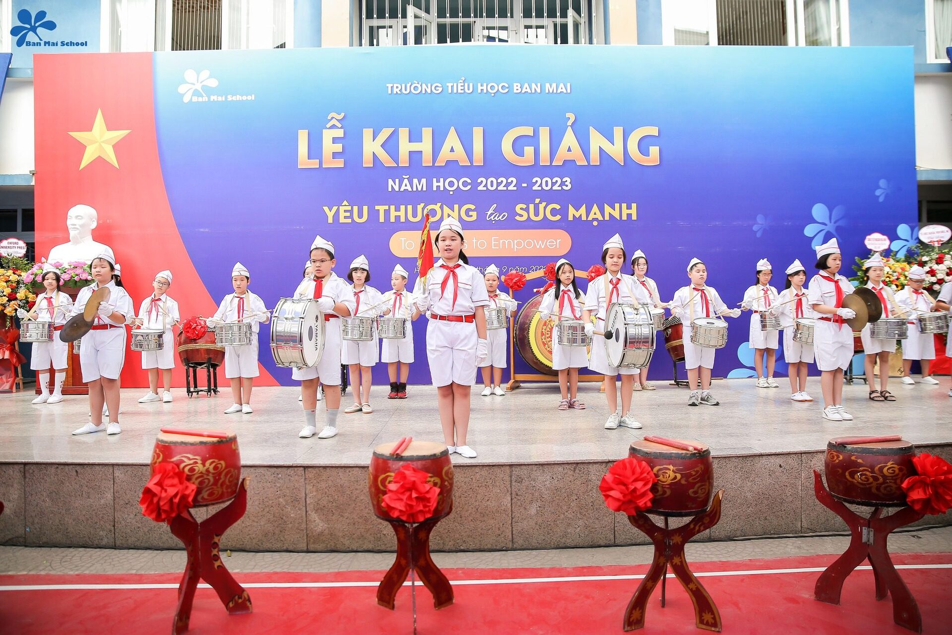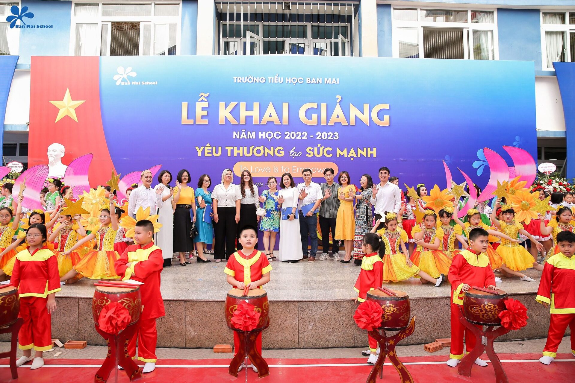 Chủ đề: “Yêu thương tạo sức mạnh” đã được thầy trò trường Tiểu học Ban Mai thể hiện rõ nét và ấn tượng qua phần trình diễn kết hợp giữa Trống hội – Võ thuật – múa hát “Ban Mai trường em”.