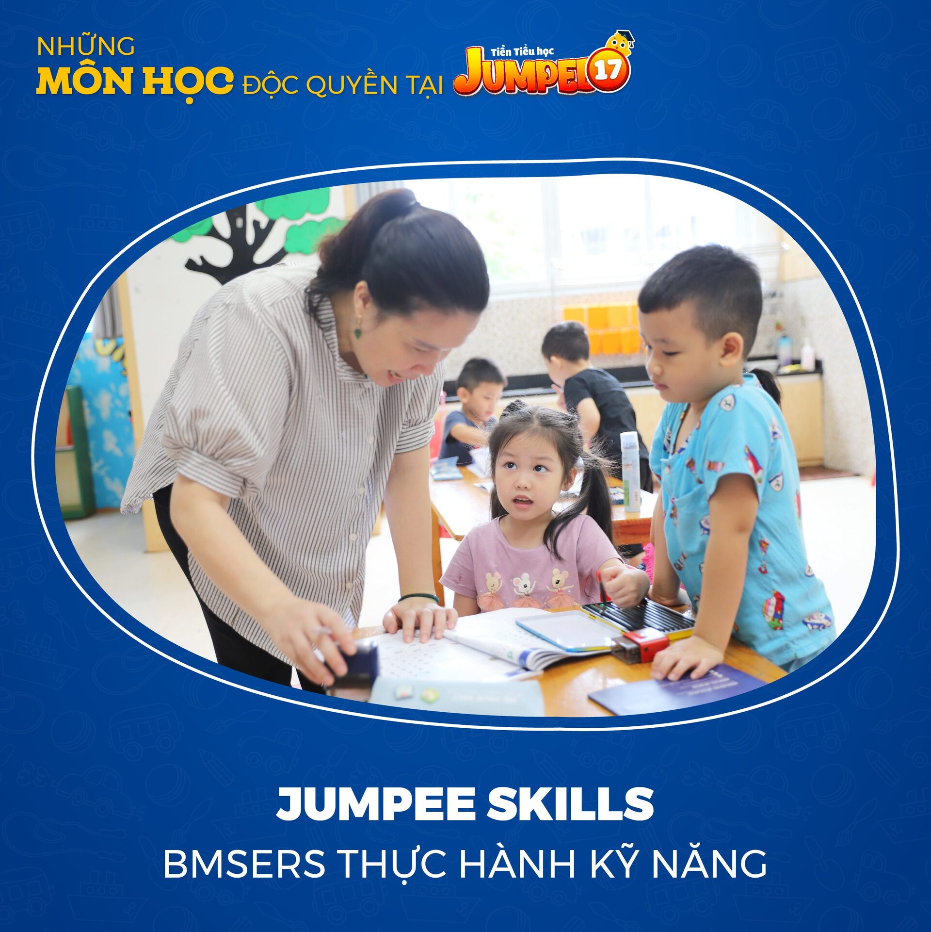 Jumpee Skills mang đến cho trẻ những bài thực hành kỹ năng cơ bản, cách giải quyết vấn đề để trở nên thật chủ động và hiệu quả trong mọi tình huống như: Kỹ năng đi vệ sinh đúng cách và biết cách gọi trợ giúp khi mắc kẹt trong nhà vệ sinh; Kỹ năng rửa tay đúng cách; Hướng dẫn cách bê đồ ăn, ngồi ăn đúng tư thế; Hướng dẫn học sinh cách mời trước khi ăn; Hướng dẫn học sinh cách dồn khay và cất khay; Kỹ năng sử dụng các đồ dùng, thiết bị trong lớp; Kỹ năng vệ sinh sau khi ăn; Kỹ năng xúc miệng nước muối; Kỹ năng chuẩn bị chỗ ngủ; Kỹ năng rửa mặt; Chơi an toàn; Kỹ năng sắp xếp đồ gọn gàng.