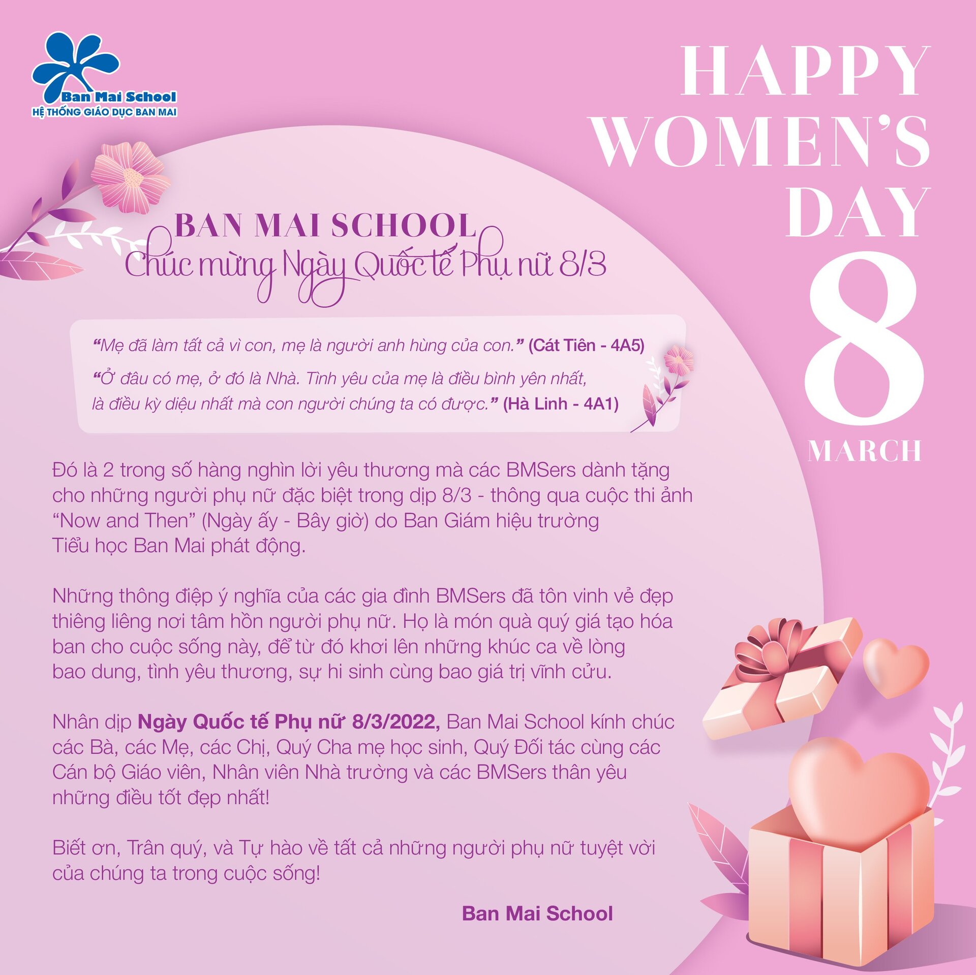 Trong không khí kỷ niệm Ngày Quốc tế Phụ nữ 8/3 năm nay, hoạt động NOW AND THEN đã thực sự để lại nhiều ý nghĩa cho không chỉ các con học sinh, các bậc phụ huynh, thầy cô, mà còn với cả cộng đồng trên cả nước,  tưới thêm những giọt nước ngọt lành vào vùng đất Yêu thương – Trân quý – và Biết ơn dành cho những người phụ nữ nói riêng, và tất cả những người chúng ta yêu thương trong cuộc sống nói chung.