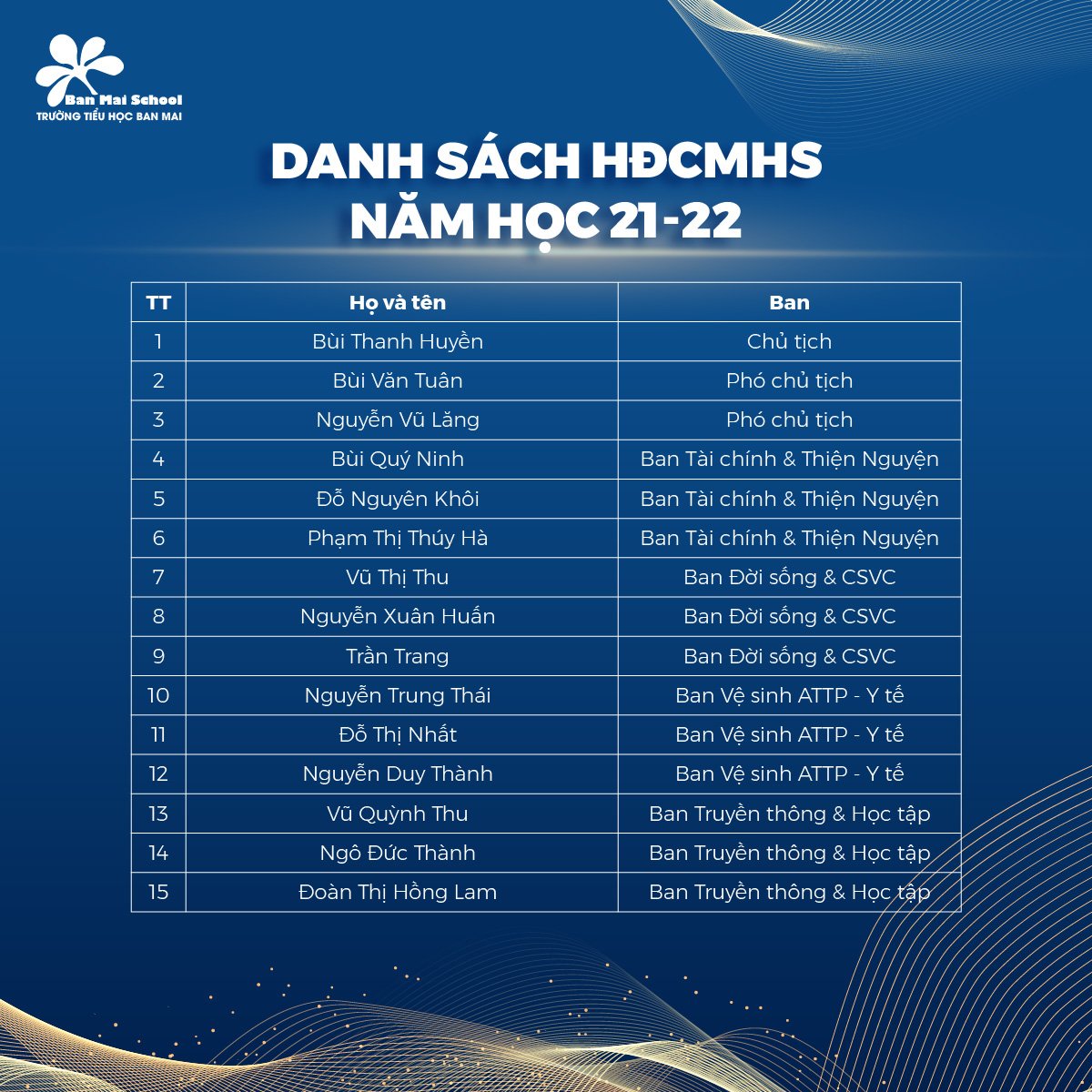 Căn cứ theo kết quả phiên họp HĐCMHS cấp Khối diễn ra ngày 25/9,  xin chúc mừng các bố mẹ đã được tín nhiệm bầu vào đội Hoa tiêu phụ huynh – HĐCMHS cấp trường năm học 2021 – 2022.