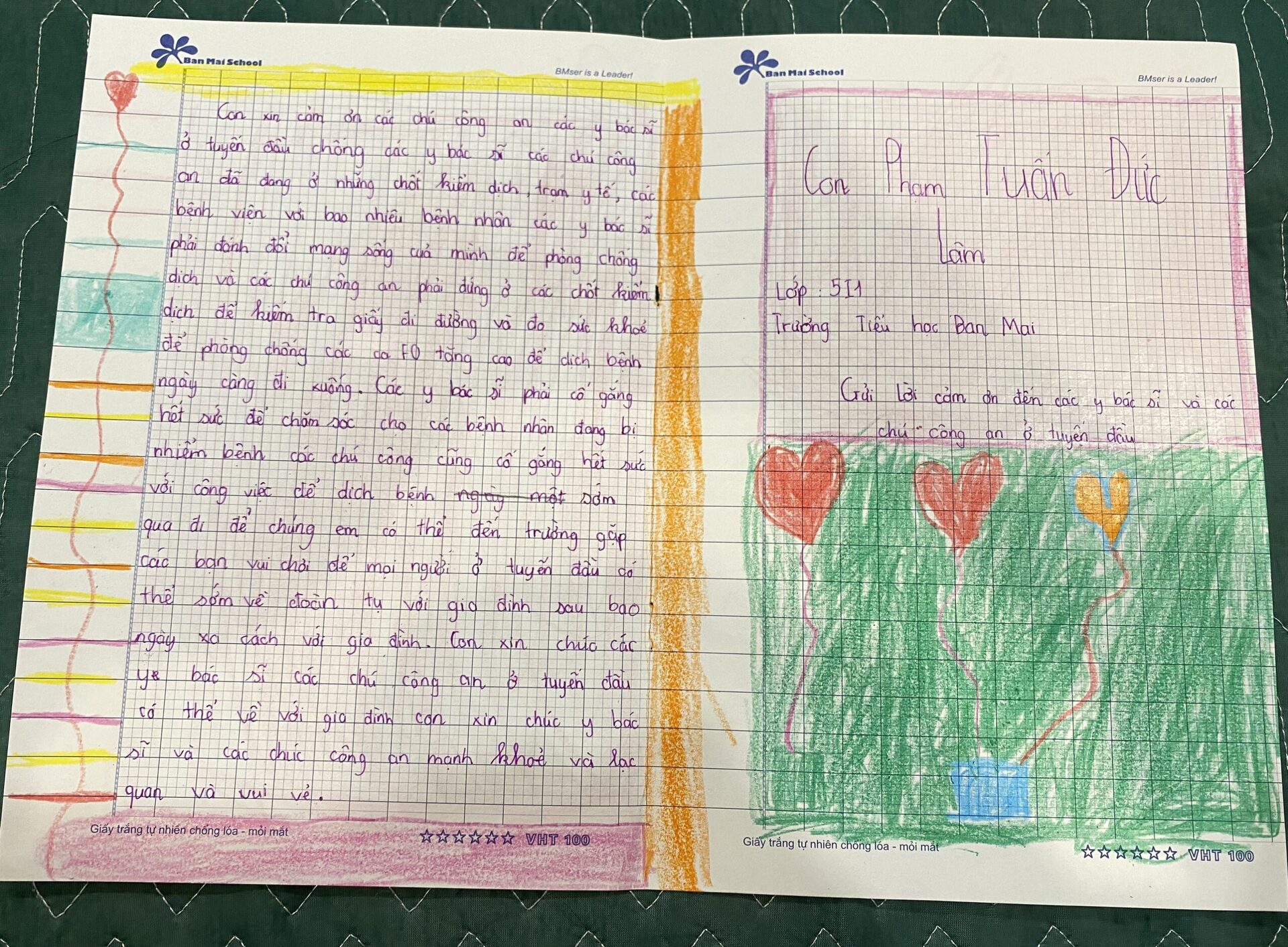 Trước thềm năm học mới, tại thời điểm này tất cả học sinh Ban Mai chúng ta đang được bình an ngồi học cô nghĩ rằng đó là một ân huệ lớn. Ngoài kia, các y bác sĩ, các cô chú bộ đội, công an đang là những người đối mặt trực tiếp với sự nguy hiểm của dịch bệnh. Họ phải lao vào vùng nguy hiểm bất chấp sự an toàn cho tính mạng, họ tạm rời xa gia đình để thực hiện nhiệm vụ.